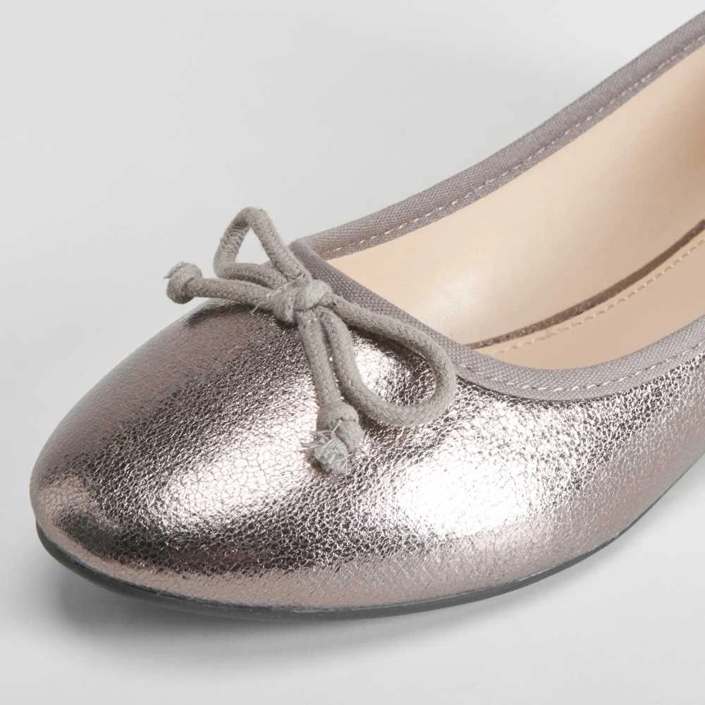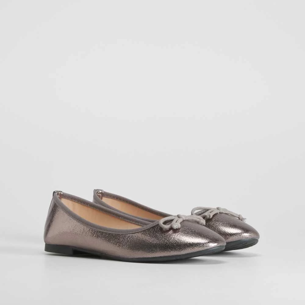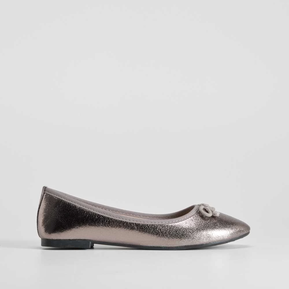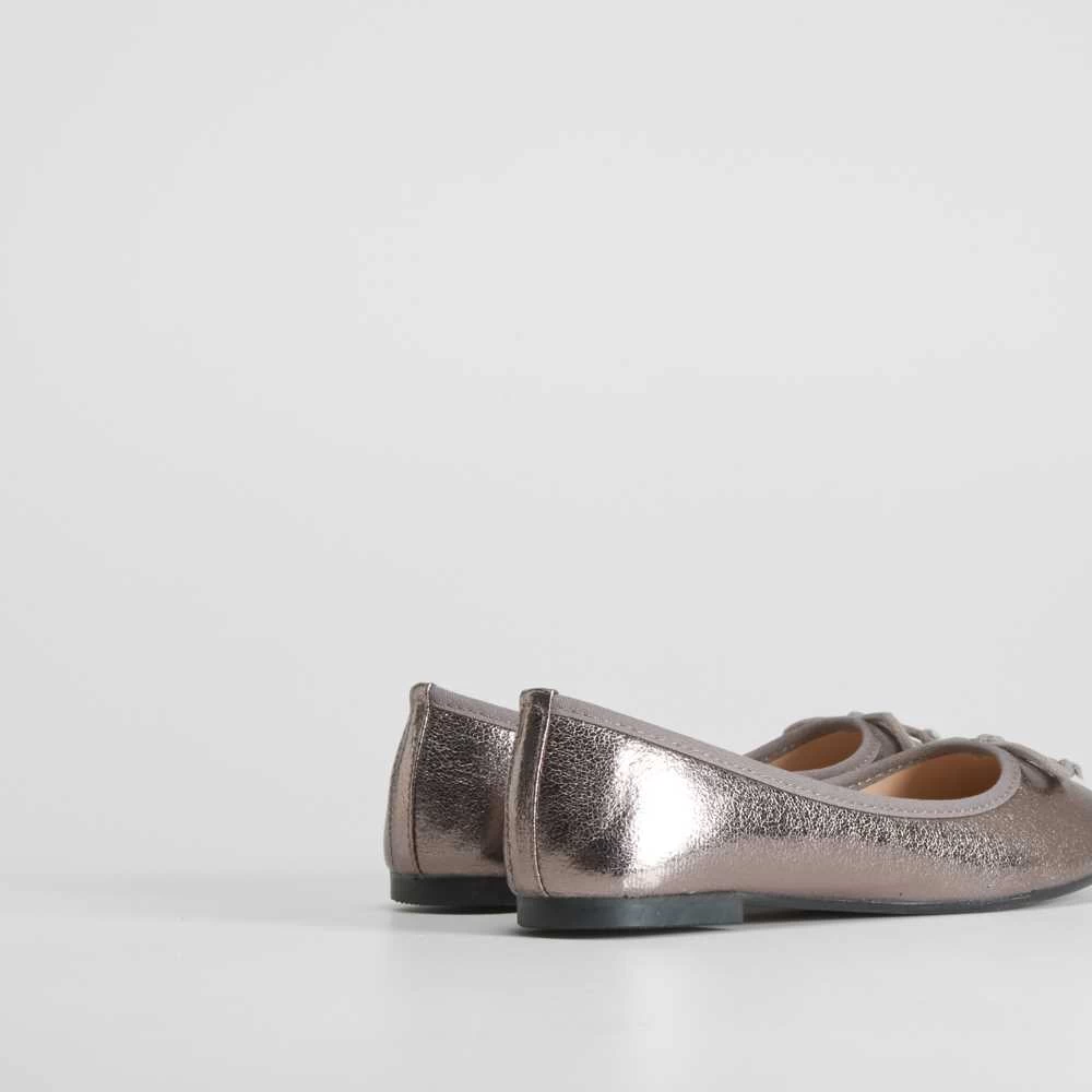 Bailarina básica metalizada para mujer de la marca PICCOLA PIU. Modelo en color plomo con un lazo combinado en la puntera.