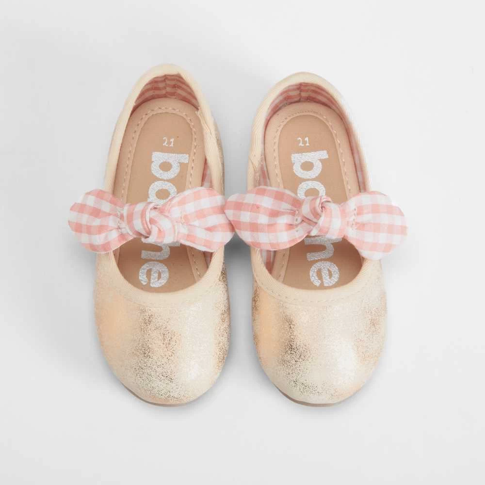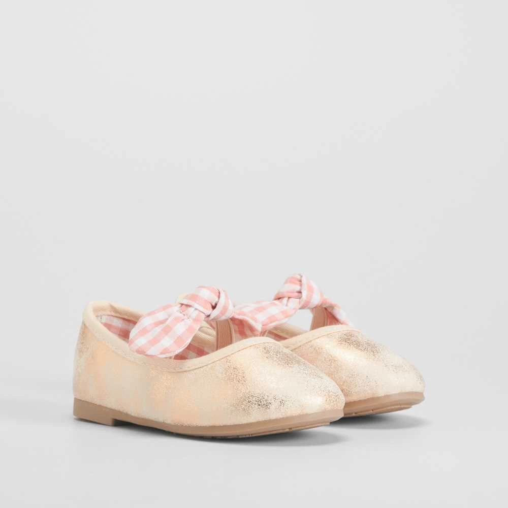 Bailarina de vestir para bebé de la marca BACHE. Modelo en color rosa con una tira elástica en el empeine adornada con un lazo vichy.