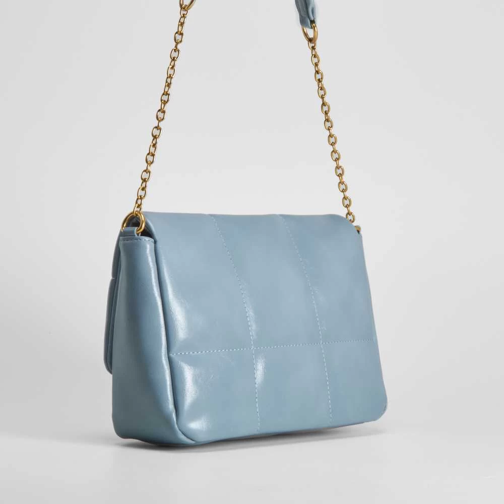 Bolso bandolera rectangular de la marca NYC en color azul con detalles acolchados, cierre en la solapa y asa combinada con cadena metálica.