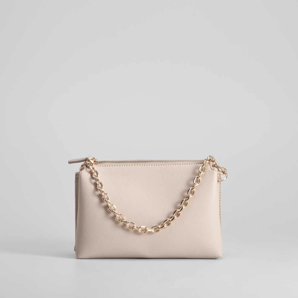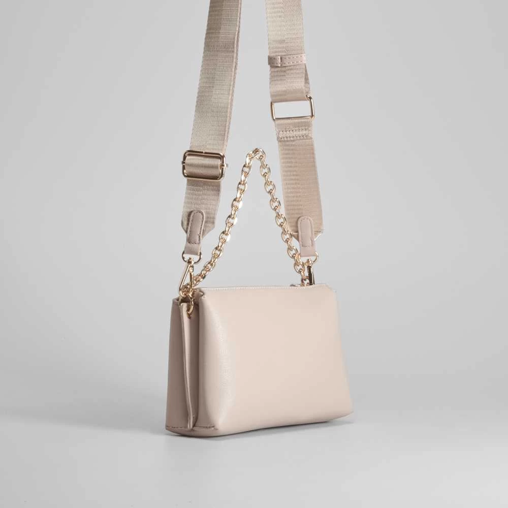 Bandolera lisa rectangular de PICCOLA PIU en color beige. Compartimento con cierre de cremallera y bolsillo interior. Cadena dorada y asa largo de nylon de quita y pon.