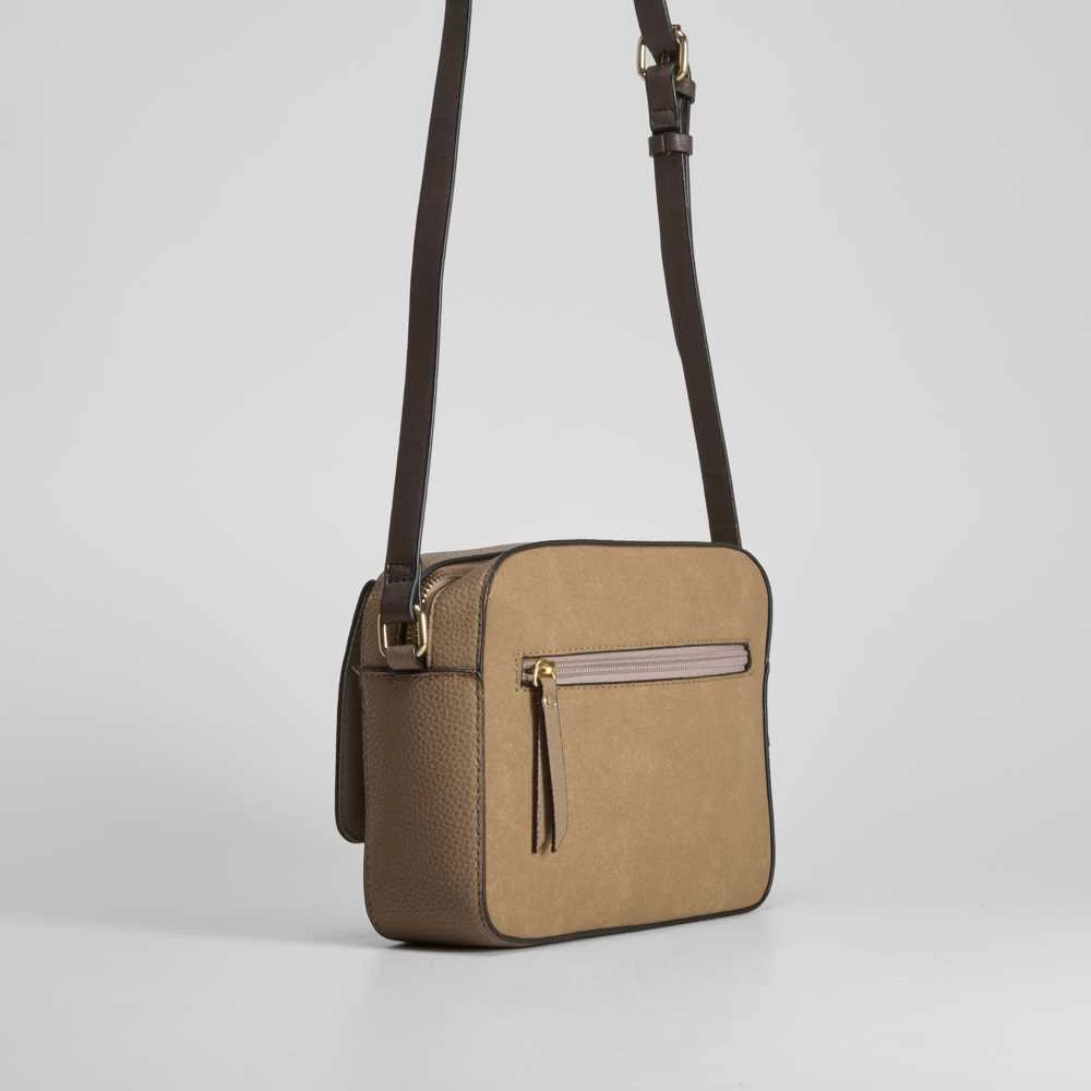 Bandolera rectangular bimaterial de PICCOLA PIU para mujer. Modelo en color taupe con dos compartimentos con cremallera y bolsillo delantero con solapa imantada. Asa combinada ajustable.