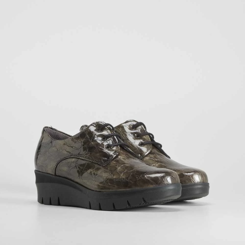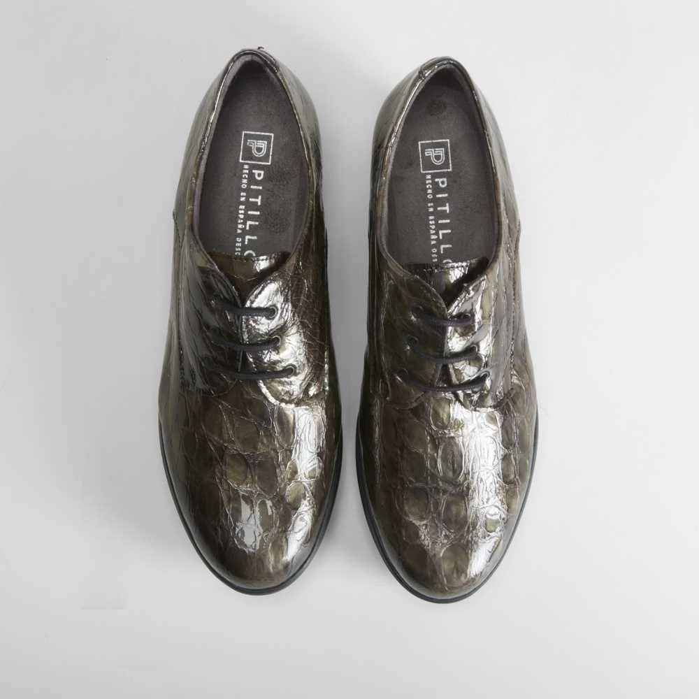 Blucher marrón con grabado de cocodrilo de la marca PITILLOS para mujer. Modelo en piel con cordones encerados y cuña baja de 4cm de altura. Hecho en España.