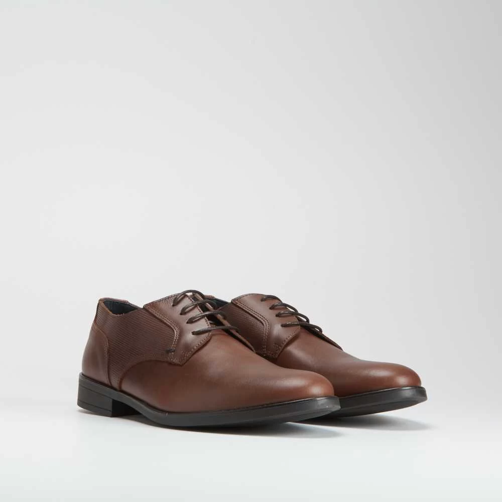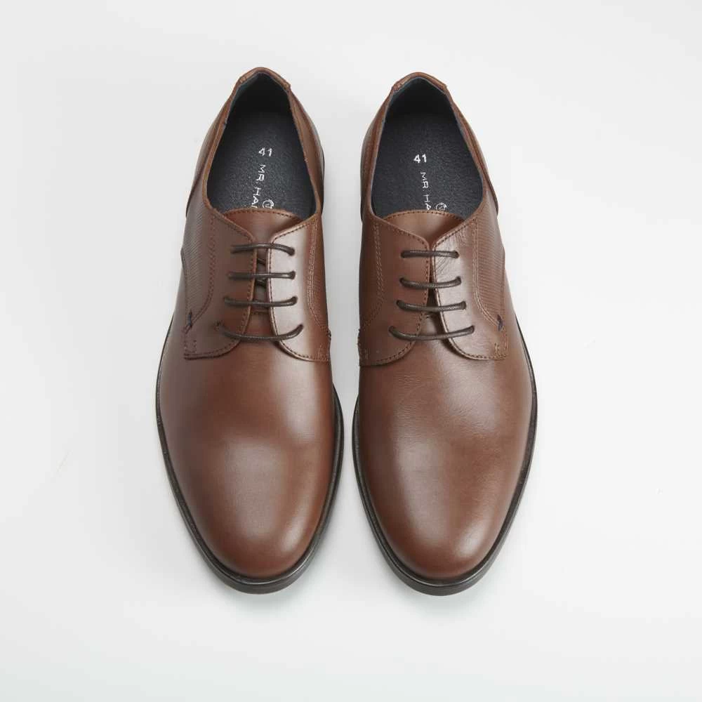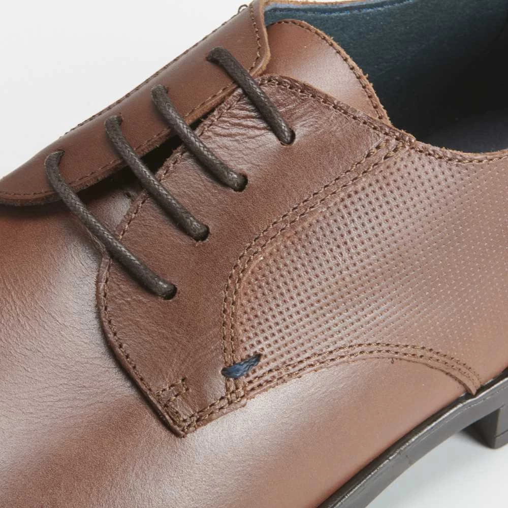 Blucher de piel para hombre de la marca MR HANSEN. Modelo con grabado lateral en color marrón y cierre de cordones combinados. Hecho en España.