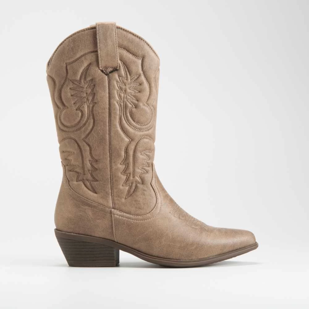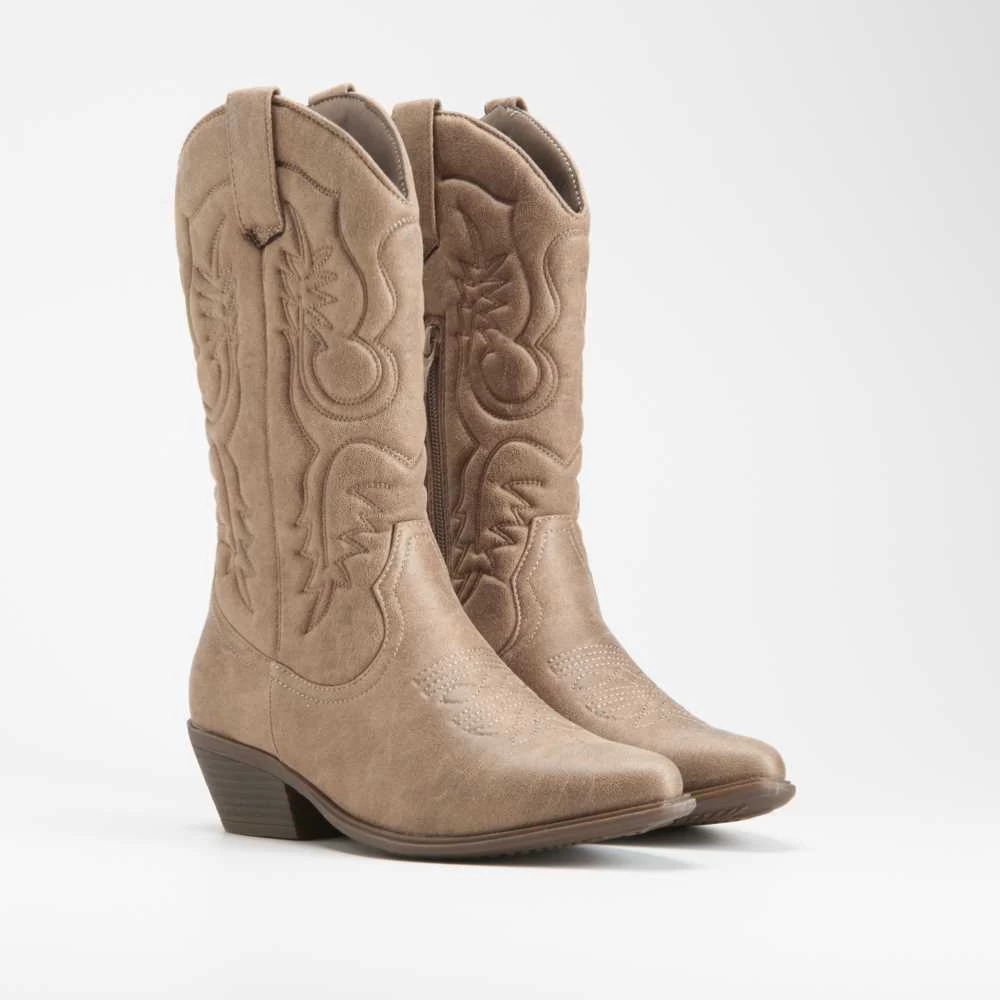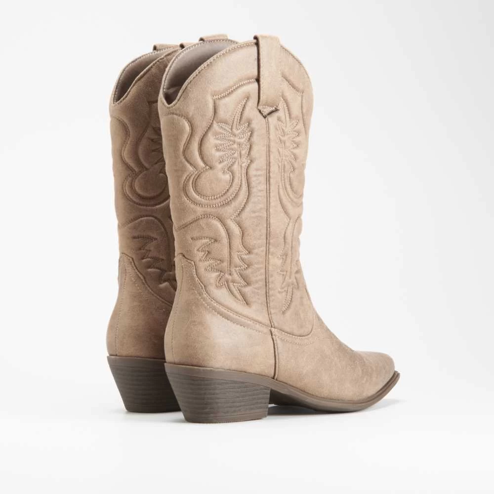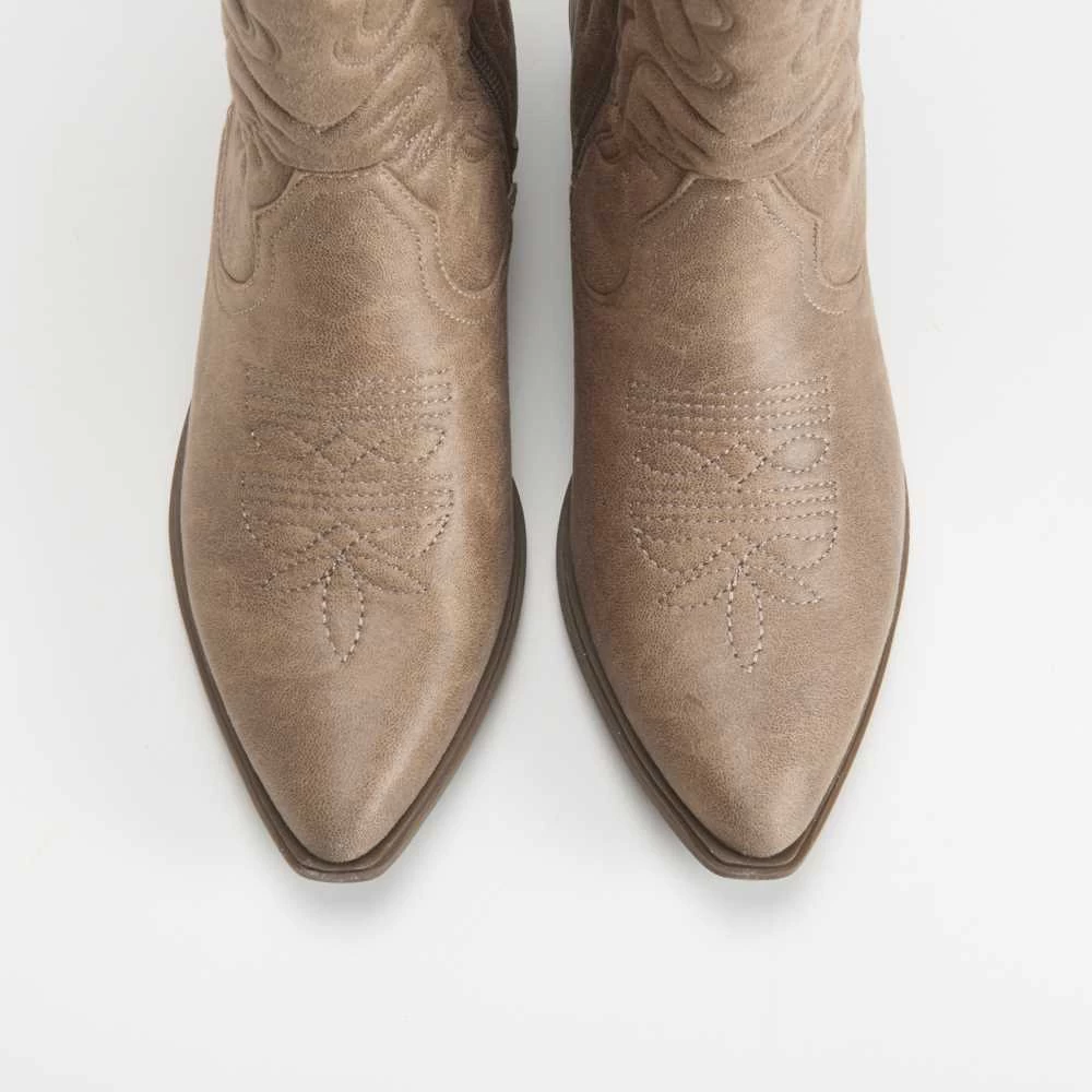 Bota campera alta para mujer de la marca NYC. Exterior grabado en color beige con pespuntes combinados y cierre de cremallera lateral. Suela con tacón bajo.