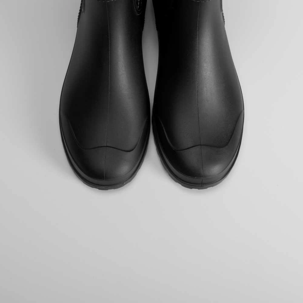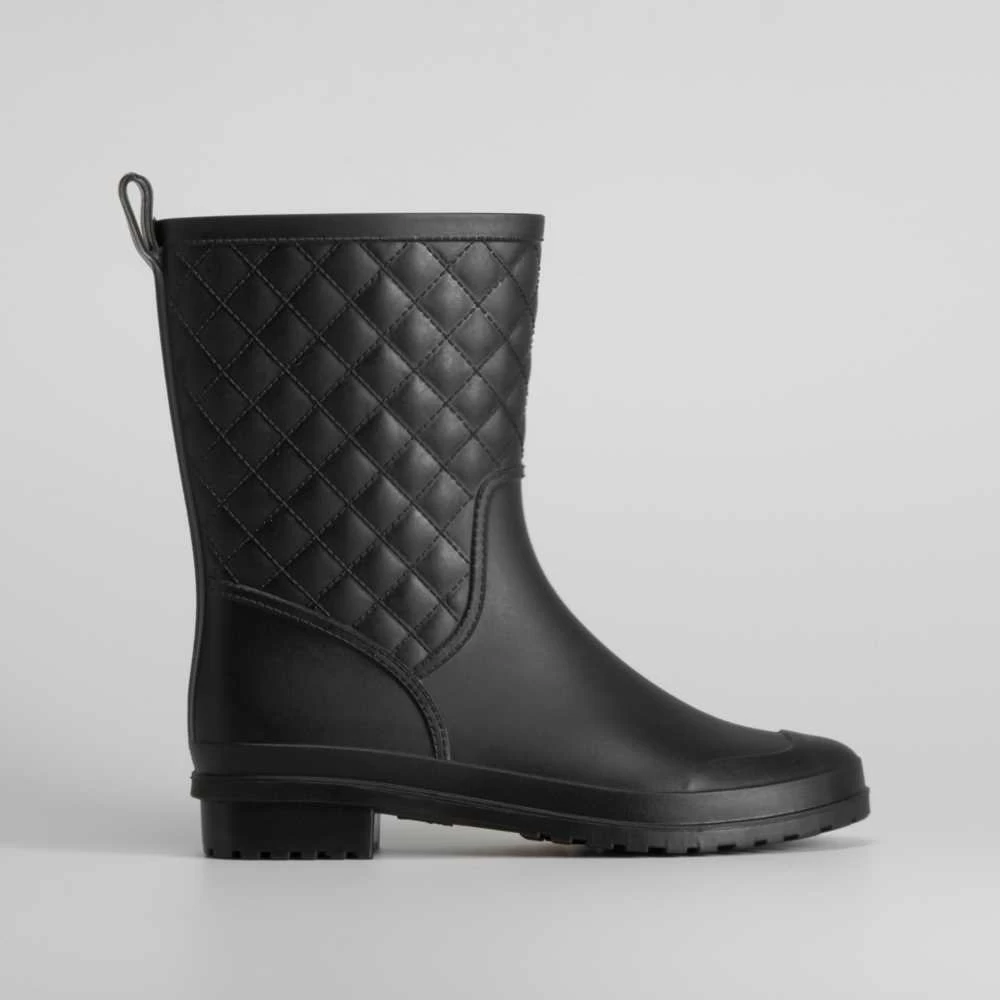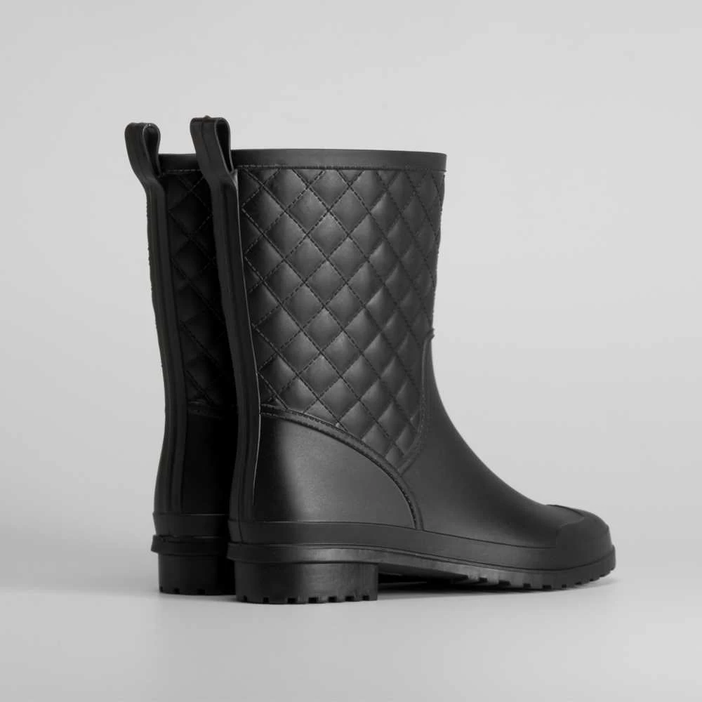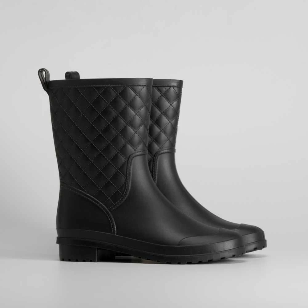 Bota de agua de caña media de la marca PICCOLA PIU. Modelo en color negro, caña efecto acolchado y refuerzo en la puntera para mayor durabilidad. Tirador en la parte posterior.