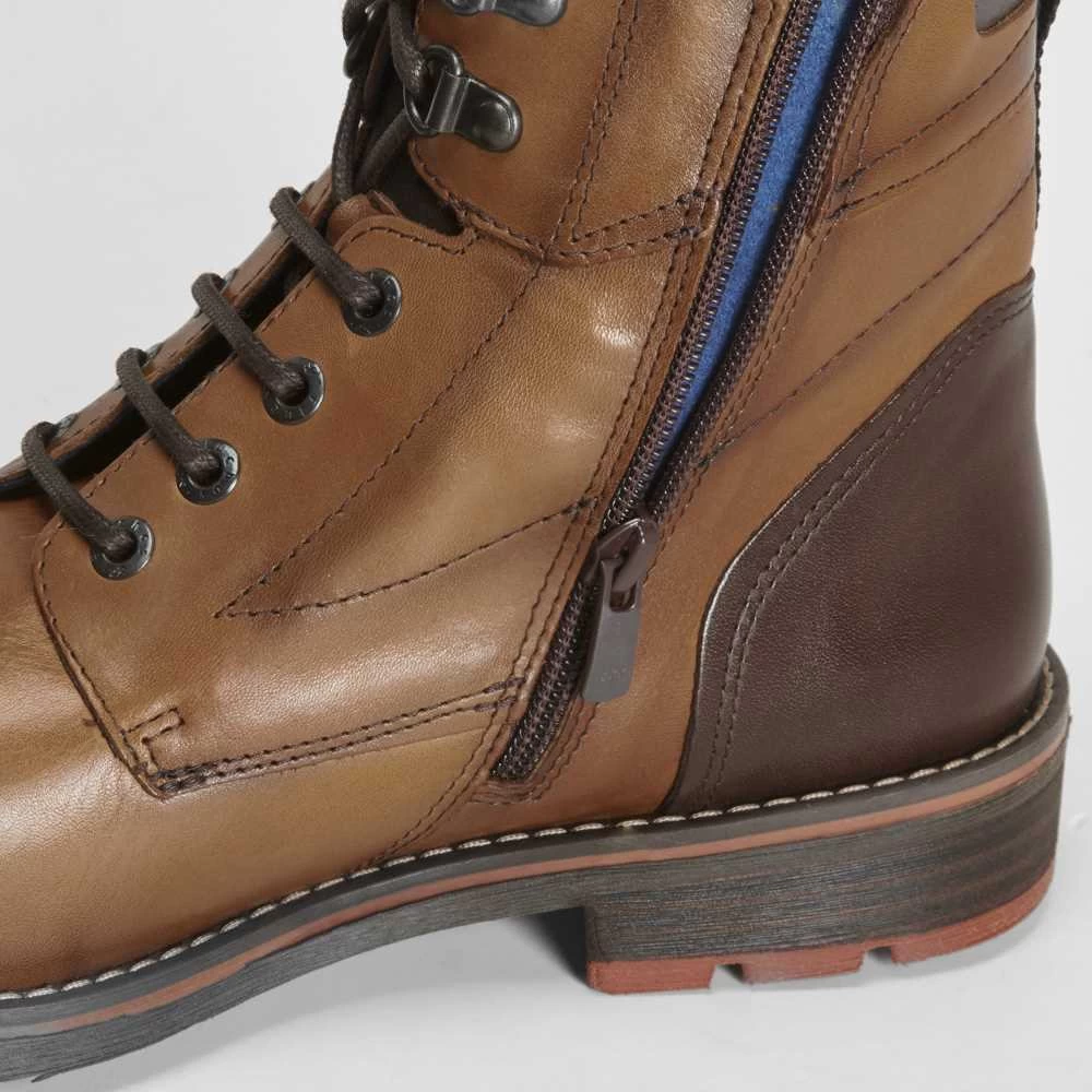 Bota de piel Terry de la marca FLUCHOS para hombre. Corte marrón y camel con cordones encerados y dos ganchos en la parte superior. Hecho en España.