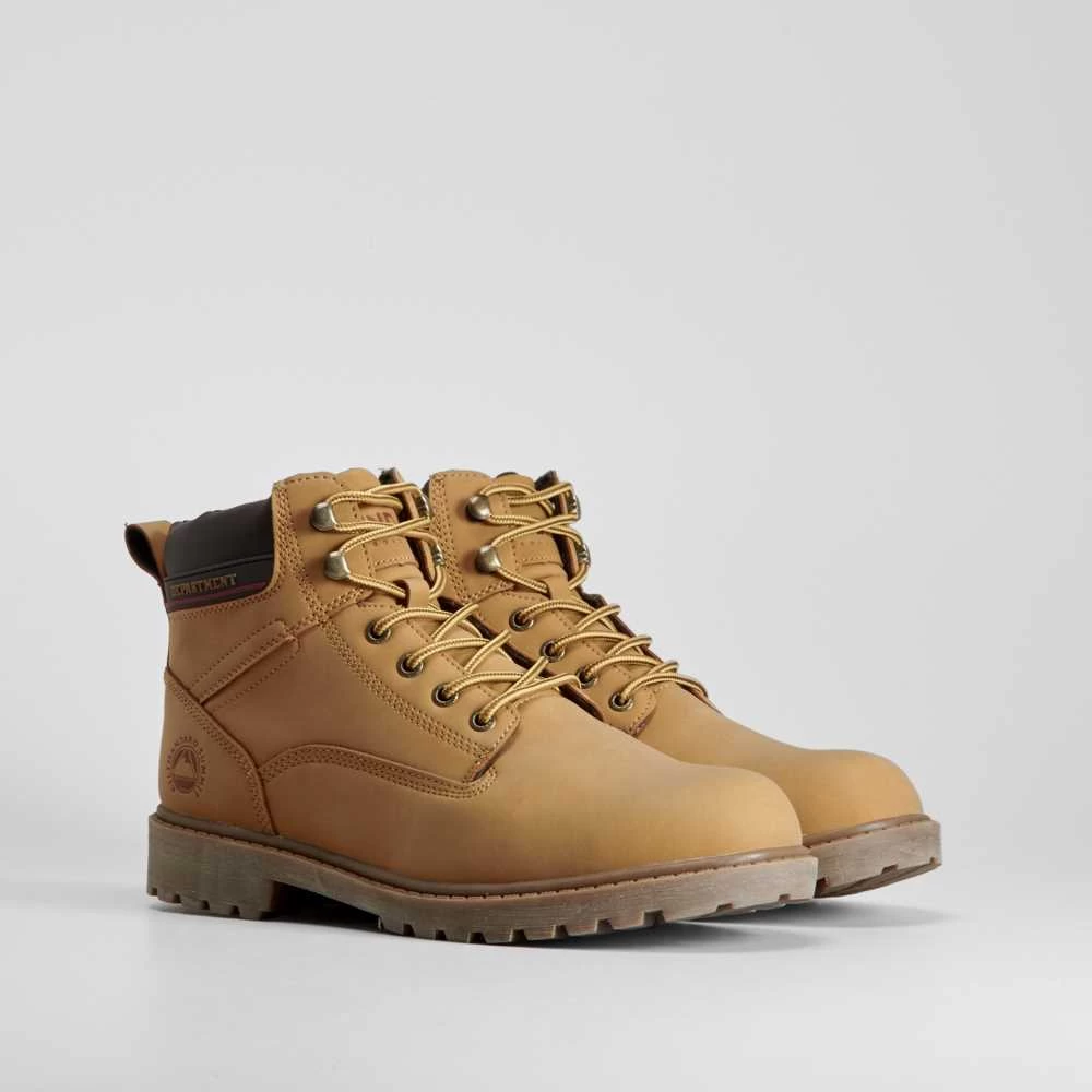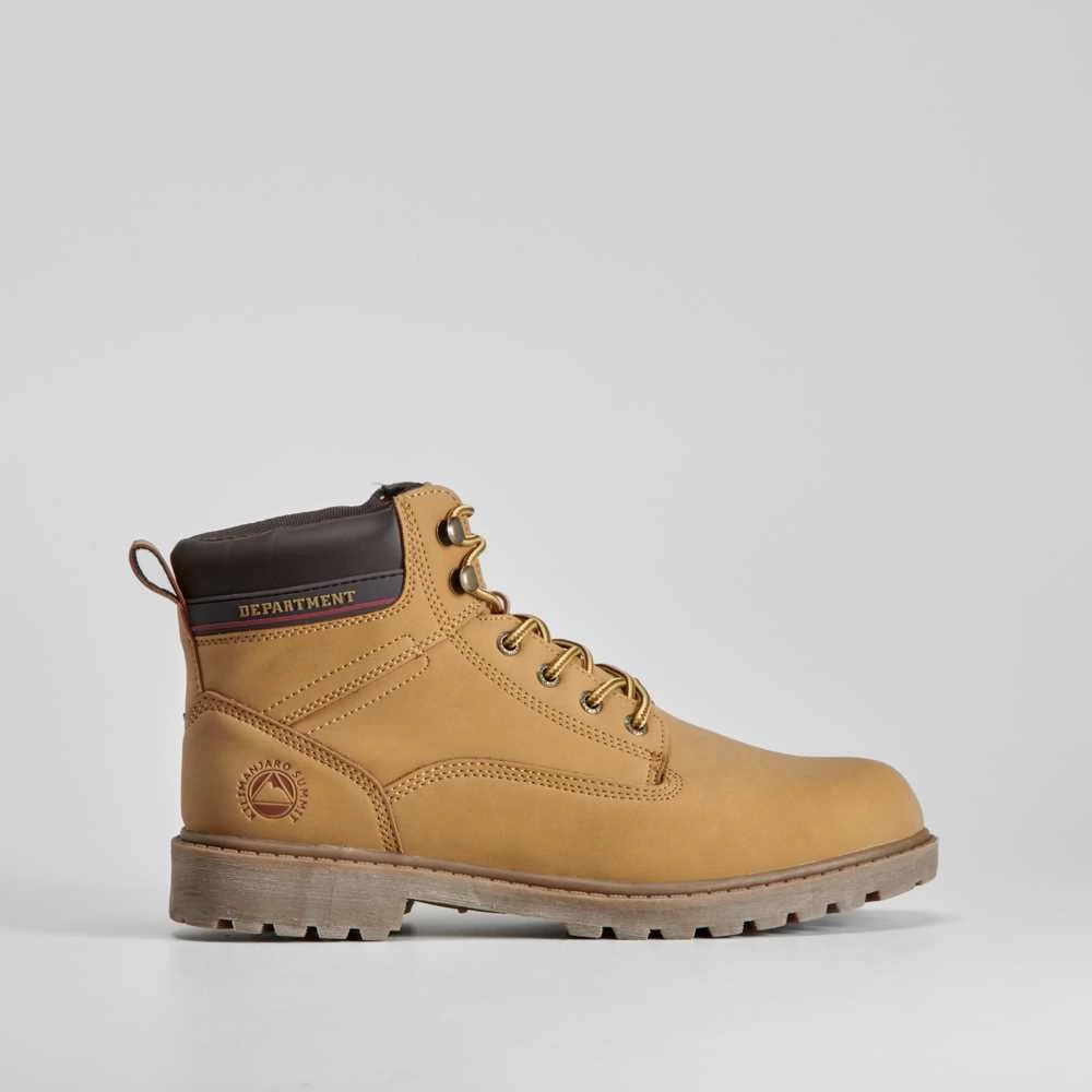 Bota de monte de color mostaza de SENDA ROAD para hombre. Modelo clásico con una piezas superpuestas, cordonera bicolor y cuello contrastado y acolchado.