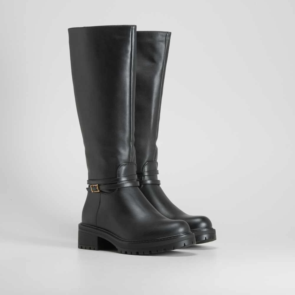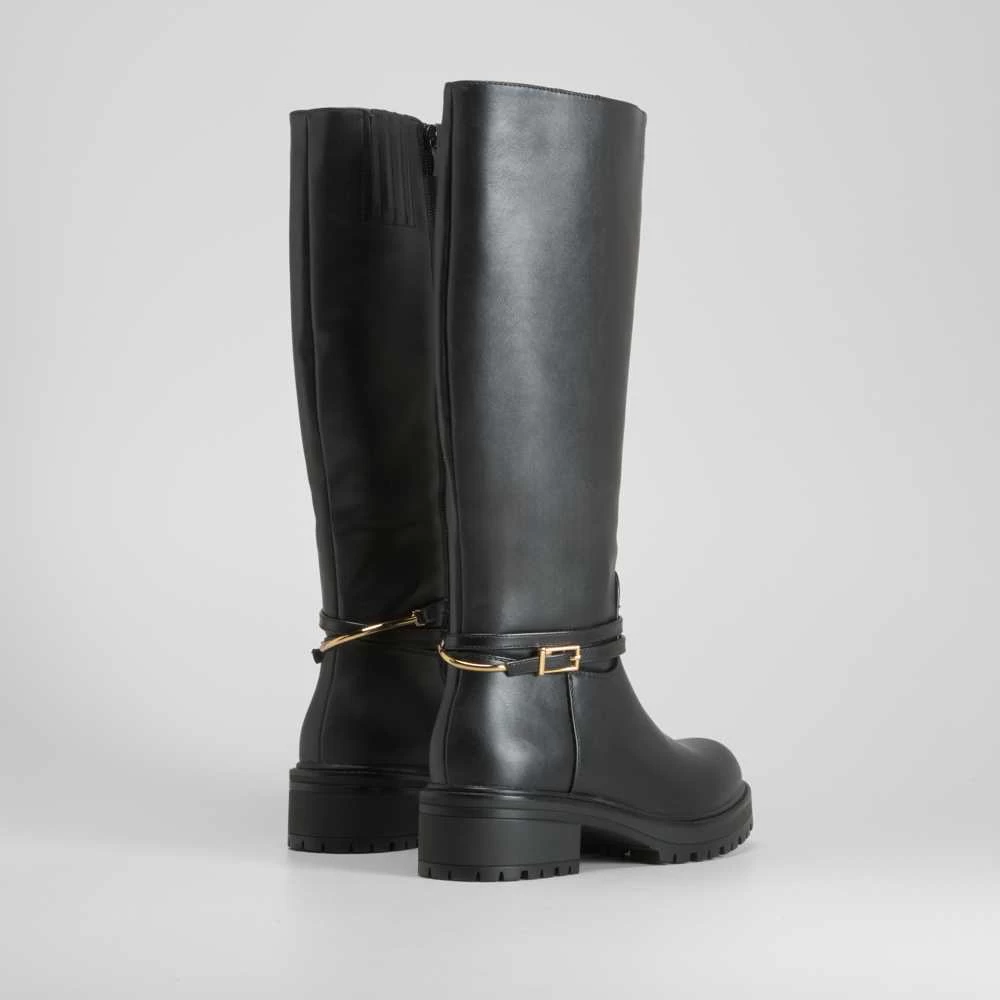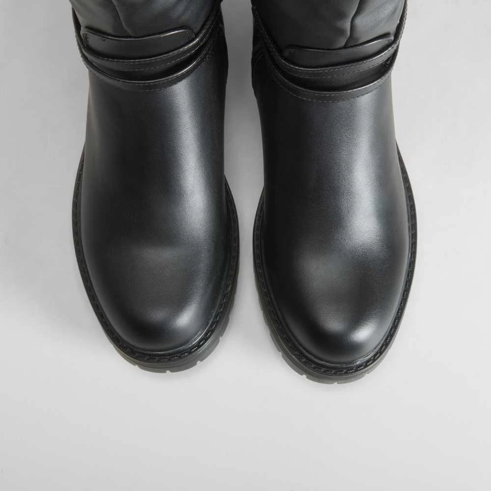 Bota plana de color negro de PICCOLA PIU. Cremallera lateral y elásticos en la parte superior de la caña. Pulseras tobilleras con detalles dorados.