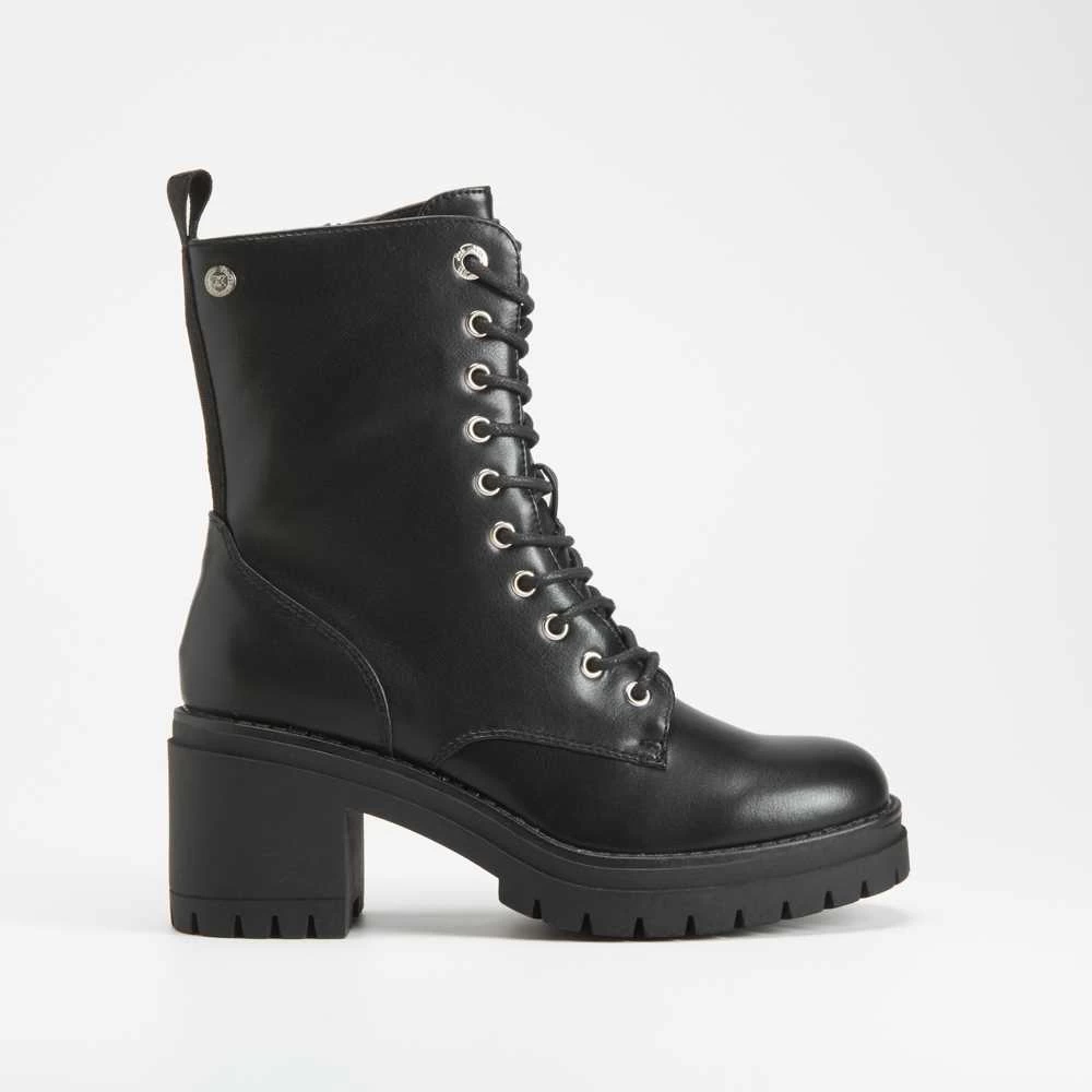 Botín para mujer de la marca XTI. Modelo de caña media en color negro, cierre de cordones y tirador trasero para un ajuste más cómodo. Suela con tacón de altura media.