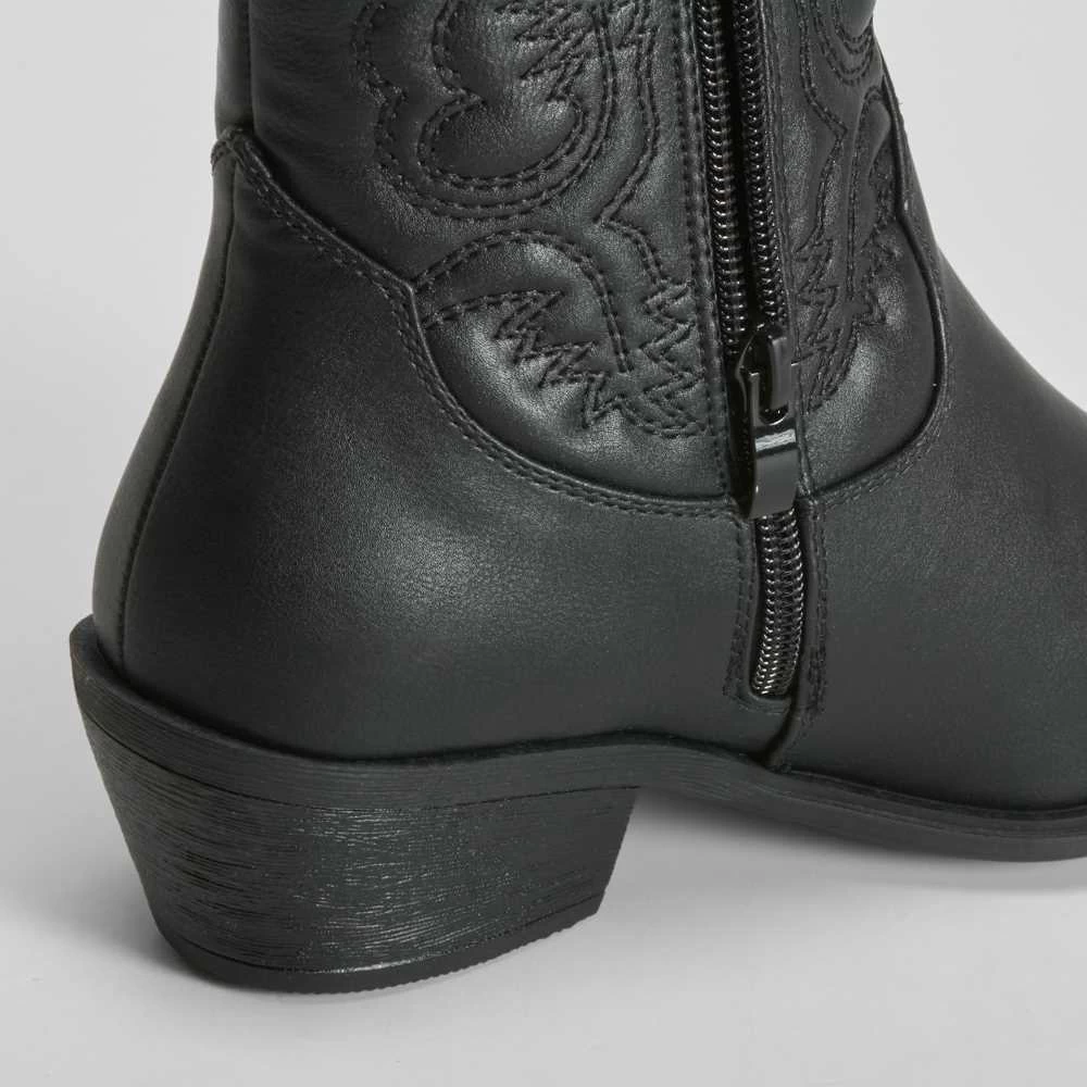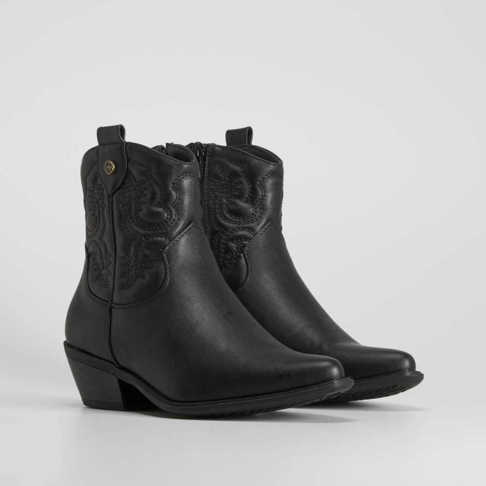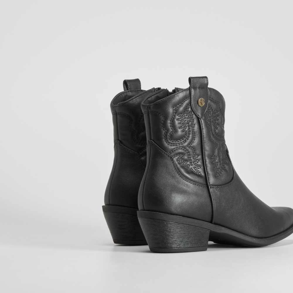 Botín campero con tacón bajo de la marca NYC. Caña adornada con bordados, tirador en la parte superior y cremallera lateral para un calce más sencillo. Tacón de 5cm de altura.