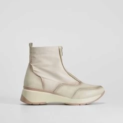 Botín deportivo de COMFEET en color beige con una cremallera central y tirador. Tecnología 3D Therapy: La plantilla 3D therapy masajea el pie en cada pisada gracias a sus microburbujas, lo que mejora la circulación y aporta suavidad en la pisada.
