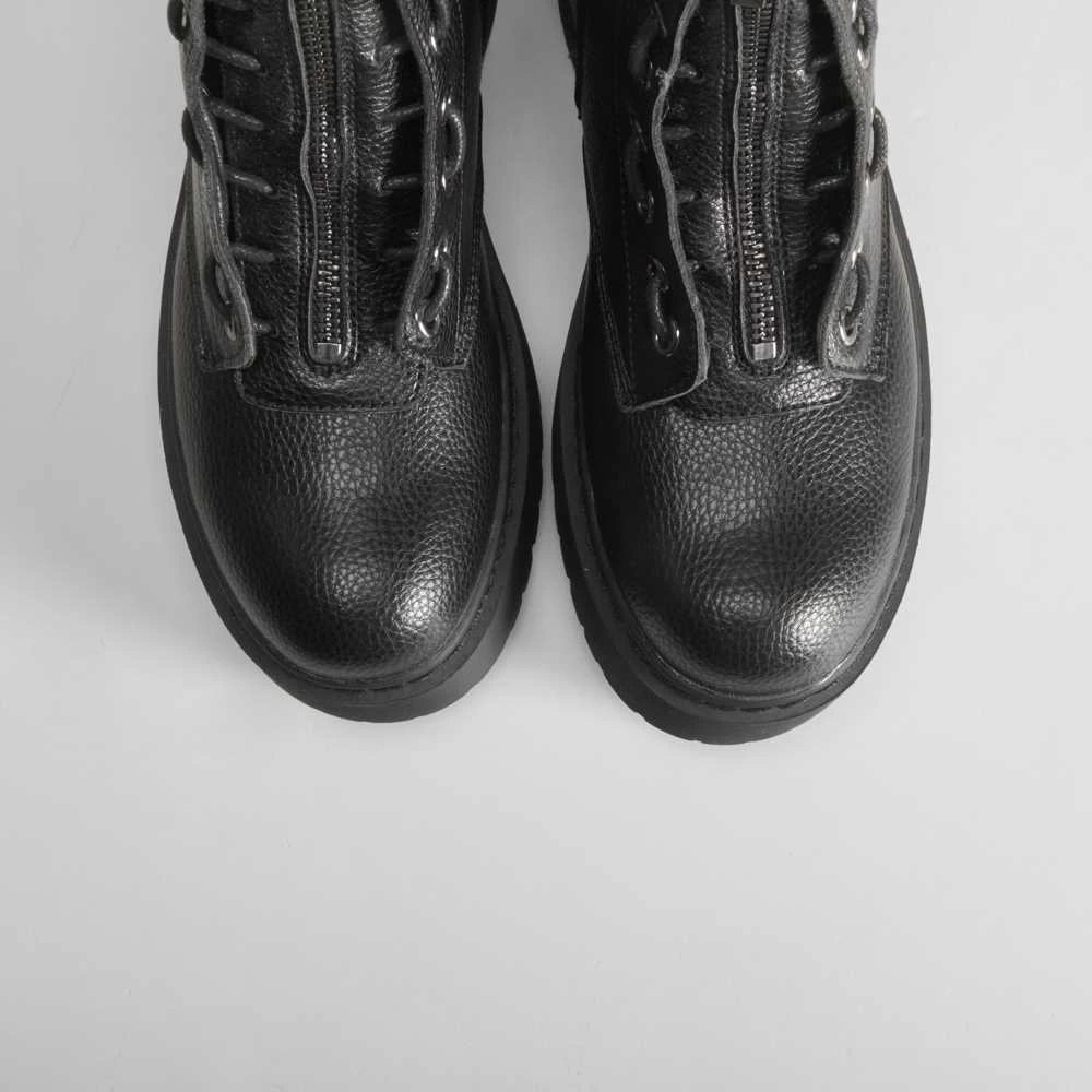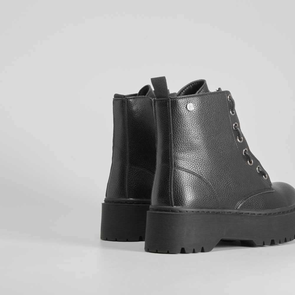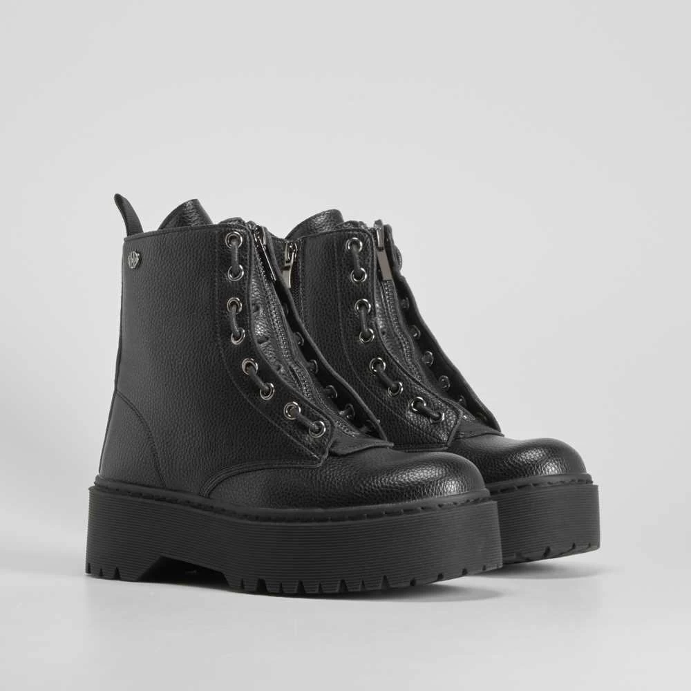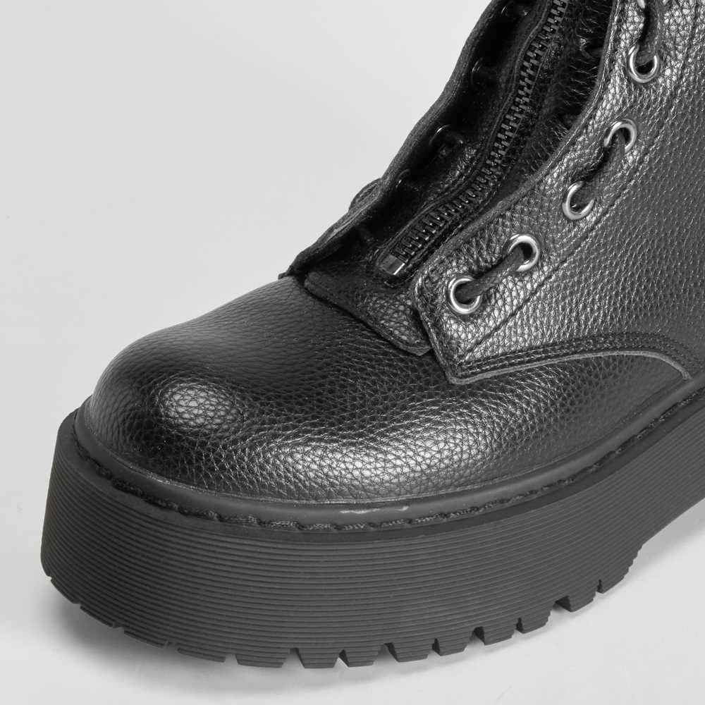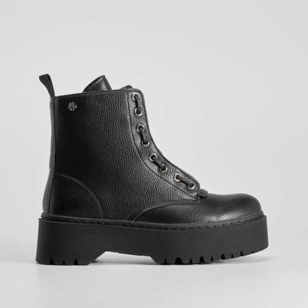 Botín militar con plataforma de la marca NYC en color negro. Modelo con cremallera central y lateral y cordones de adorno. Detalle tirador en la parte posterior.
