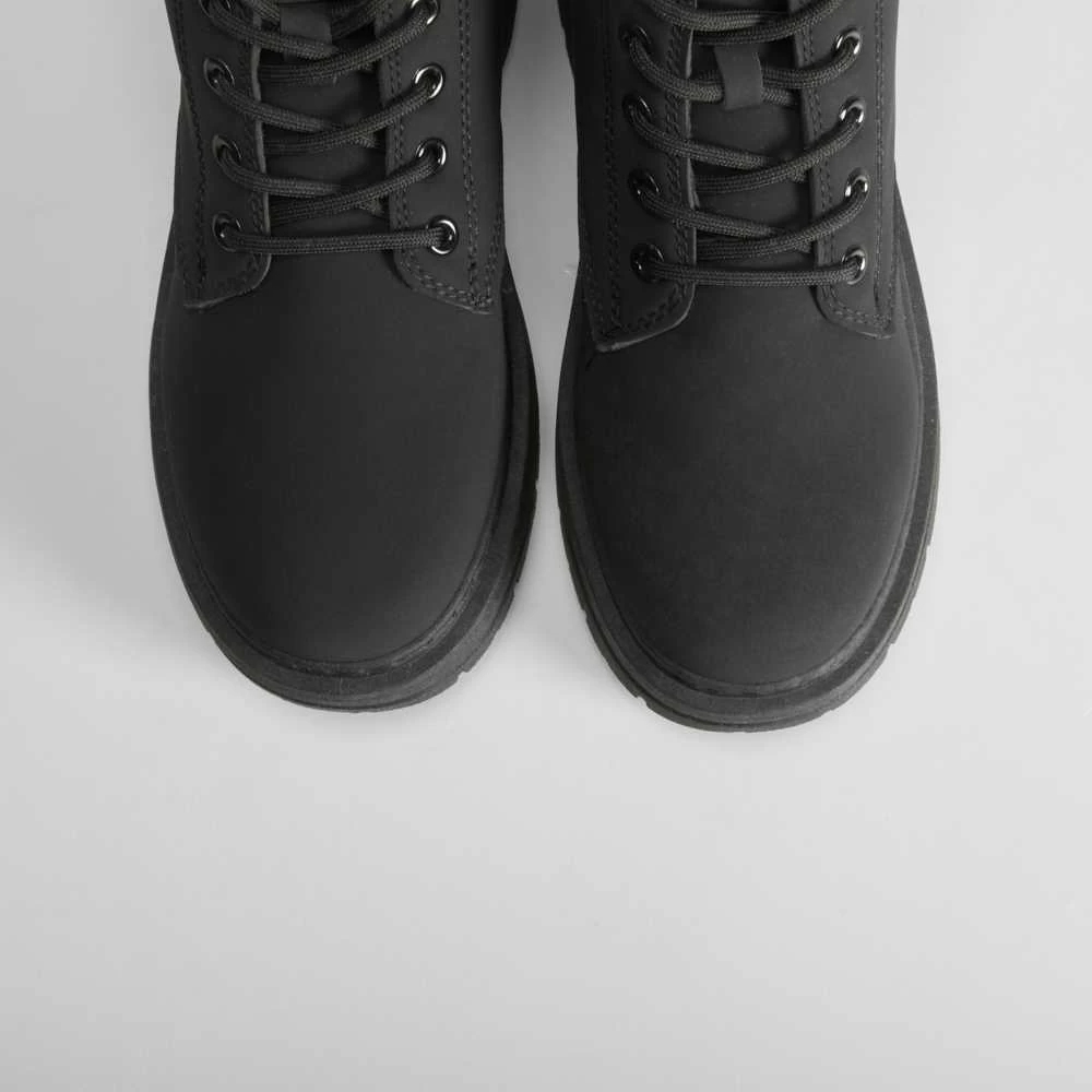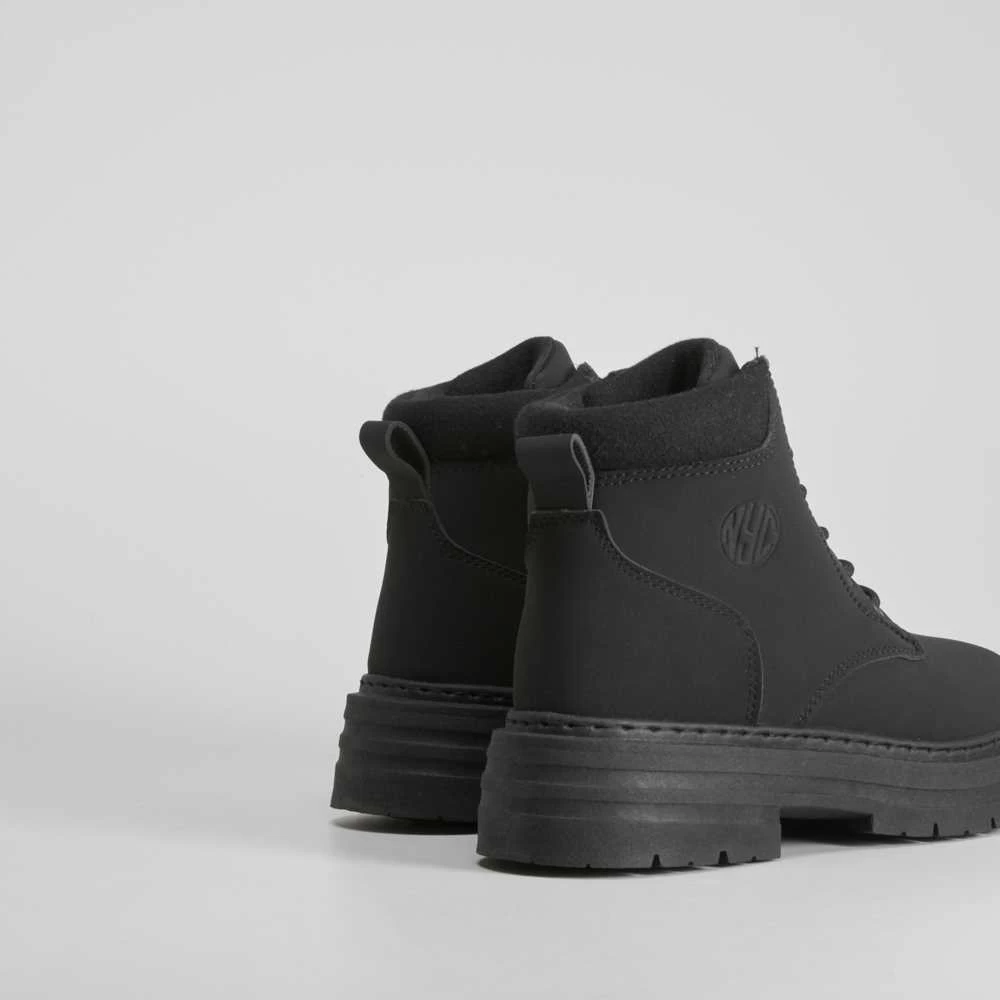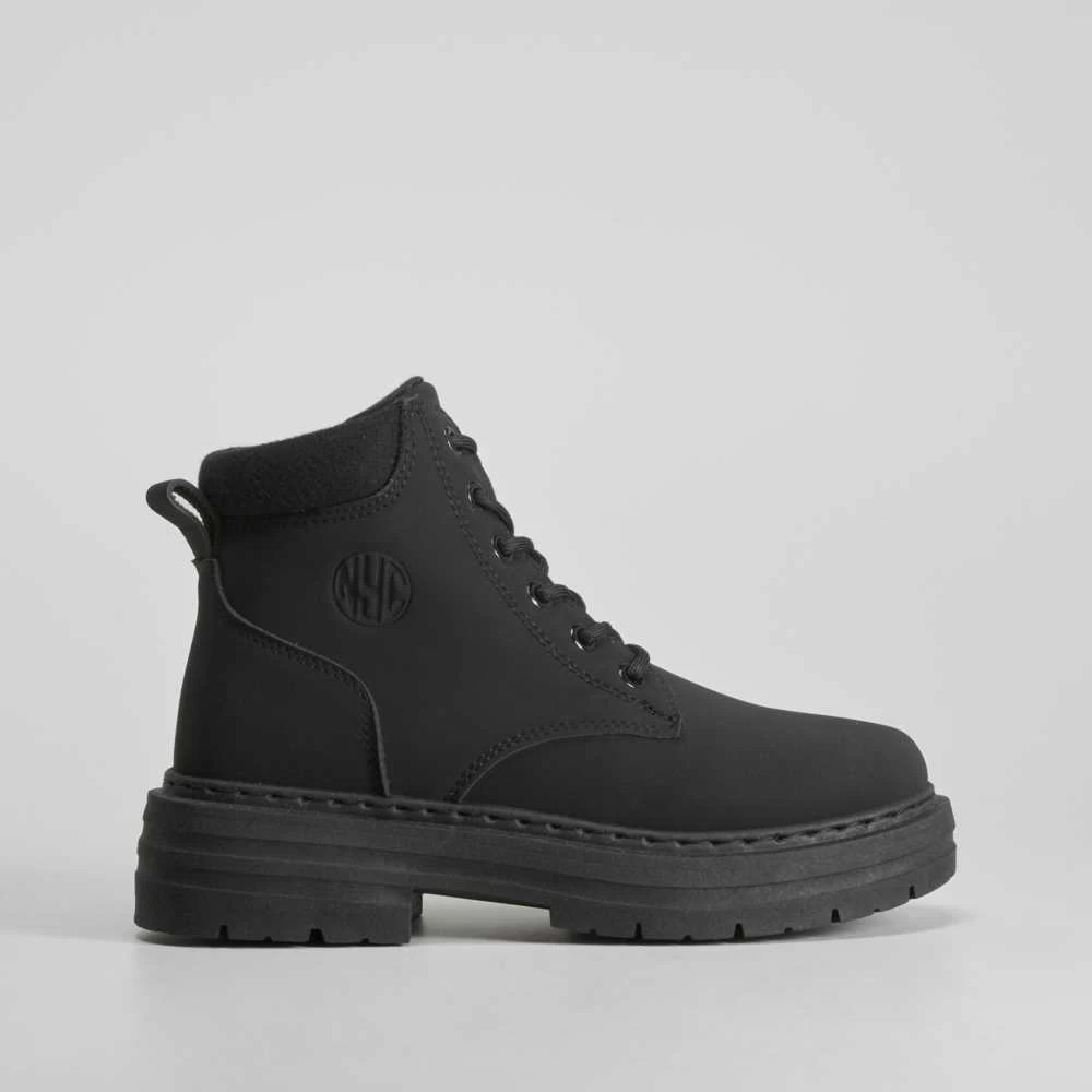 Botín plano básico de montaña para mujer de la marca NYC. Modelo en color negro con cordones entonados y cuello acolchado. Detalle grabado en el lateral.