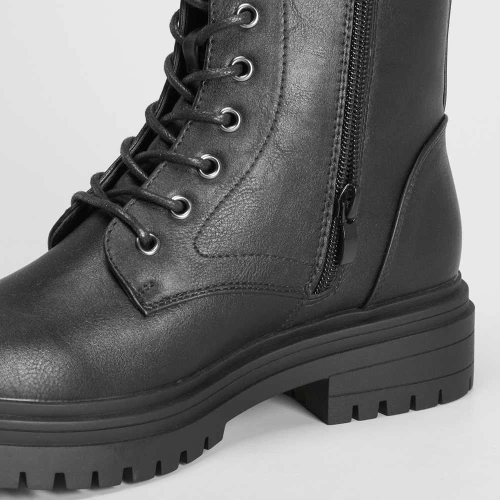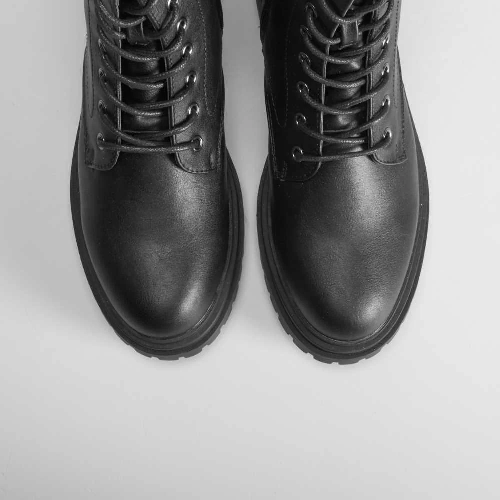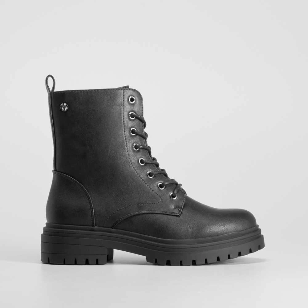 Botín plano de estilo militar de NYC para mujer en color negro. Cierre de cordones y cremallera lateral.
