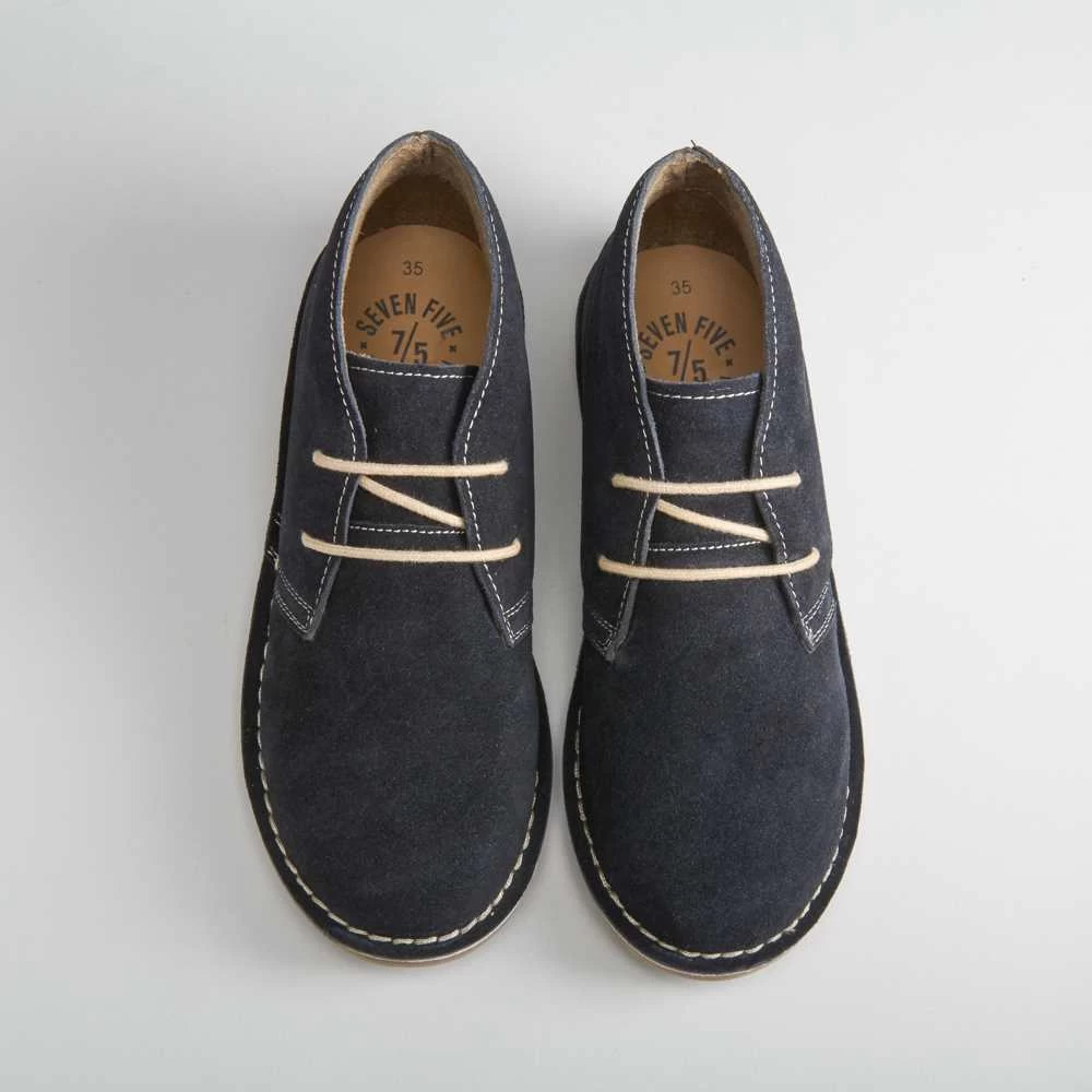 Botín pisamierdas de SEVEN FIVE para niños. El corte es de piel en color gris y azul marino con pequeños cosidos contrastados y una cordonera con dos ojetes.