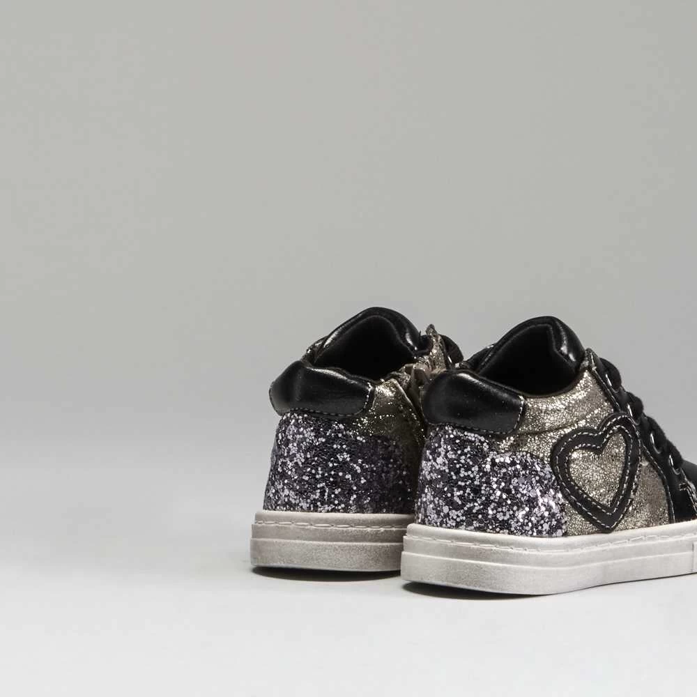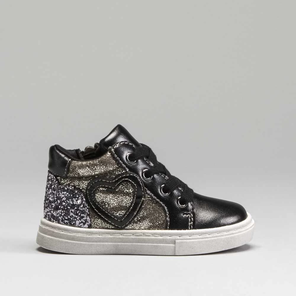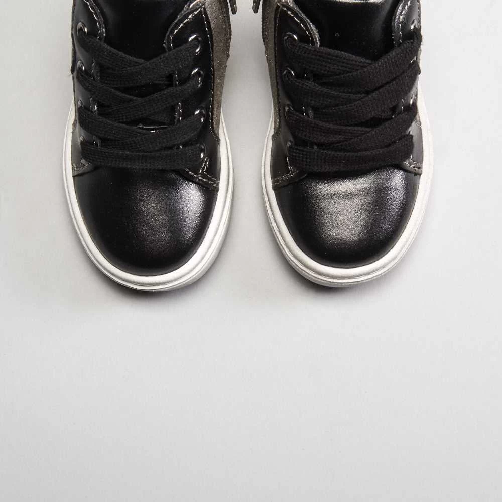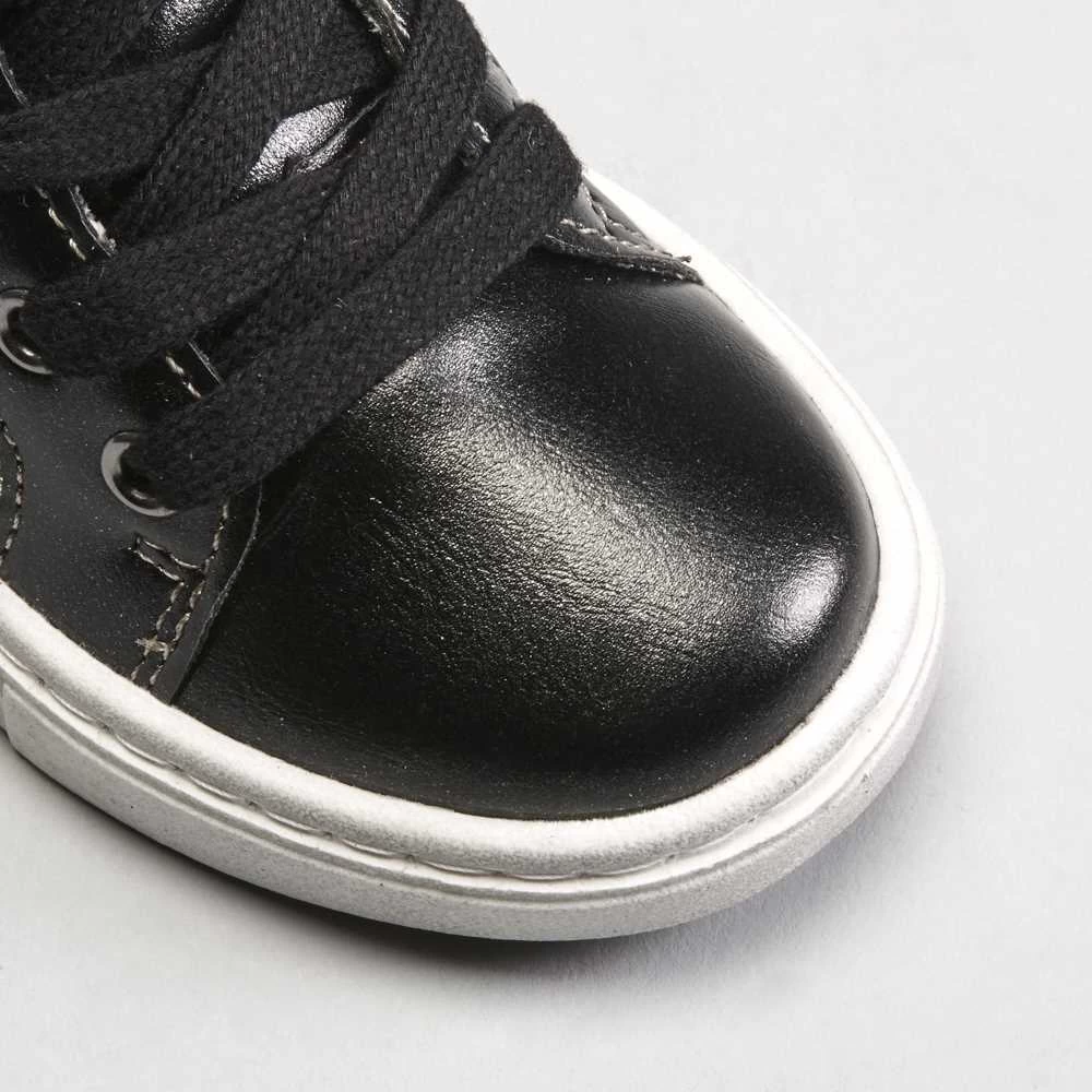 Zapatilla urbana abotinada para bebé de la marca BACHE. Corte en color negro con detalles metalizados y brillantes, cierre de cordones y práctica cremallera lateral.