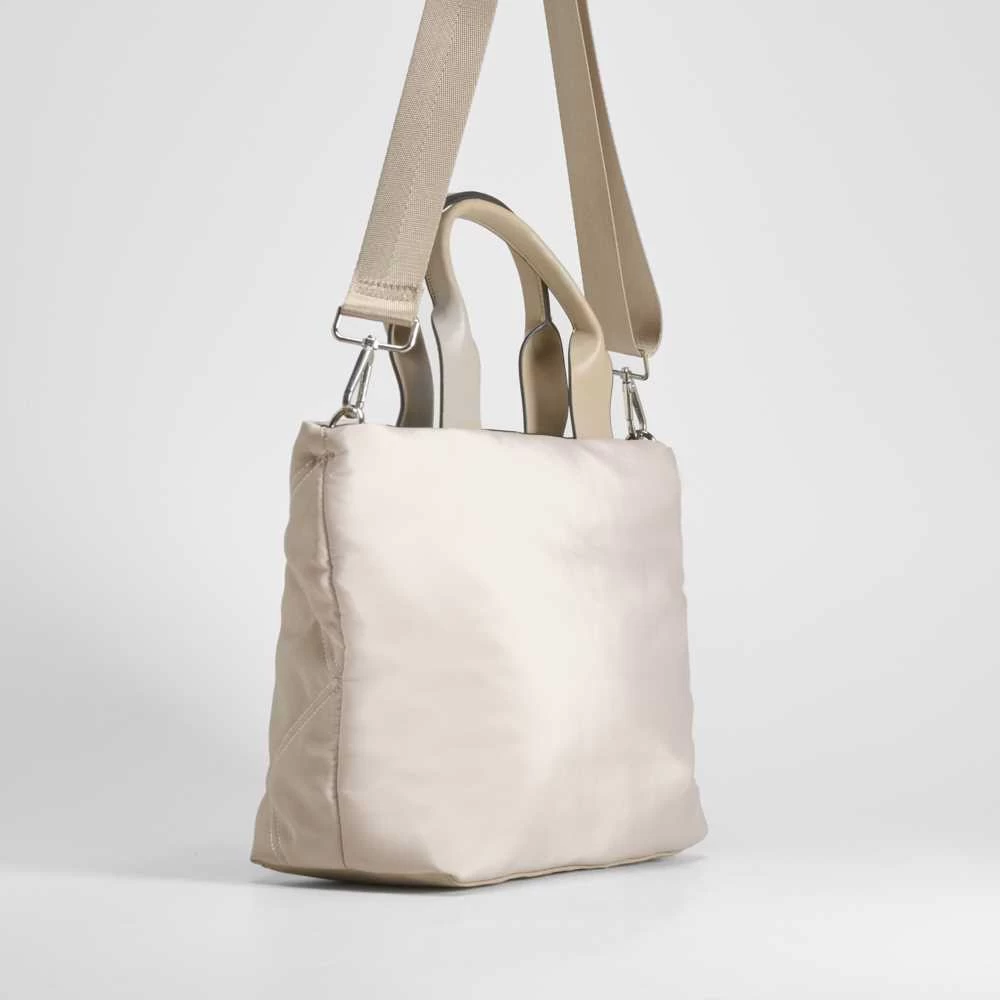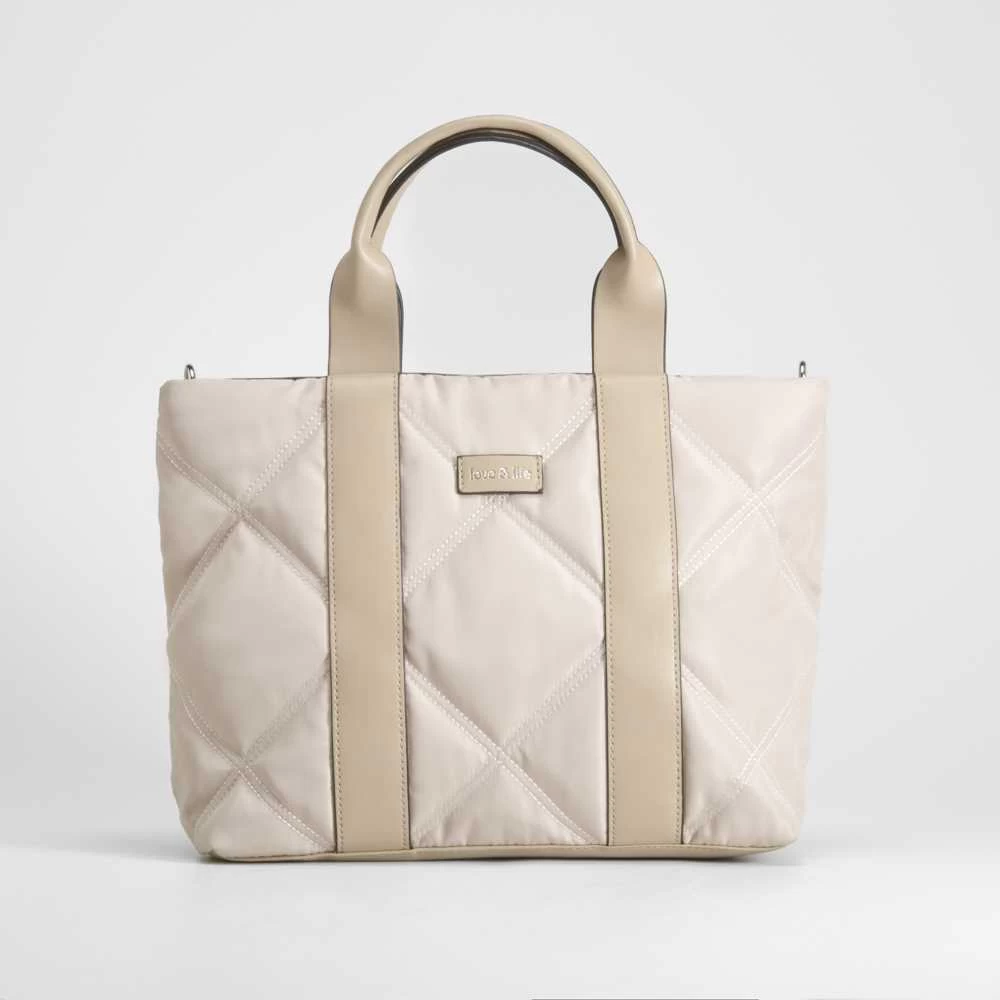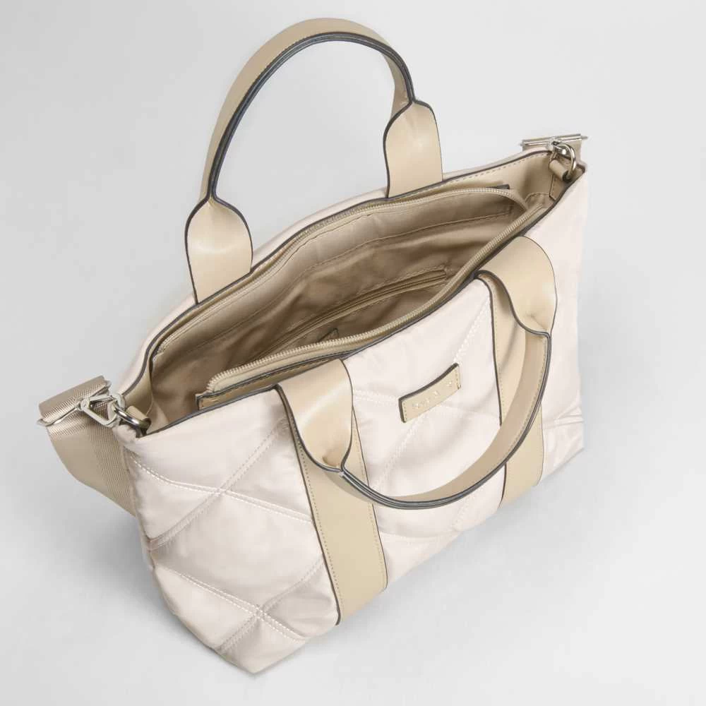 Bolso bowling de nylon con detalle acolchado de la marca PICCOLA PIU. Modelo en beige con dos asas fijo y una larga de quita y pon. Compartimento con cremallera y bolsillo interior.
