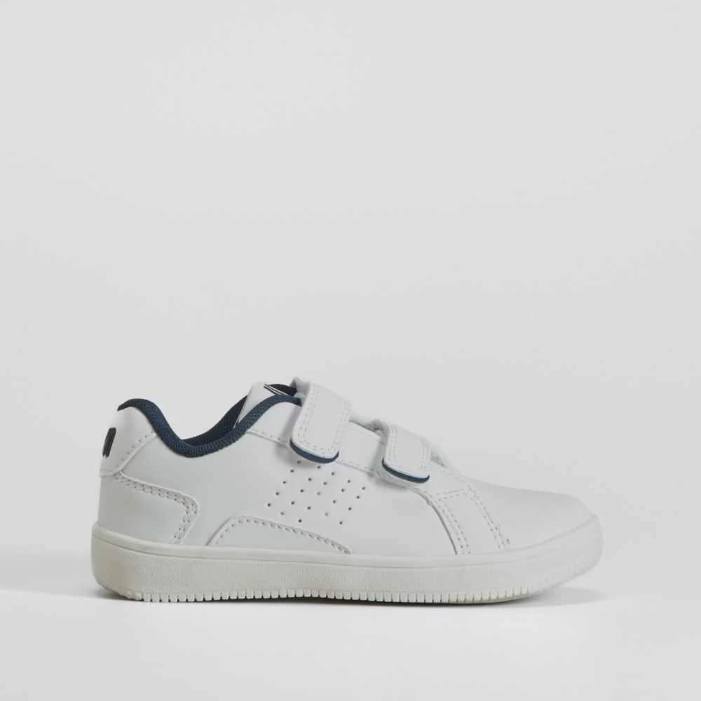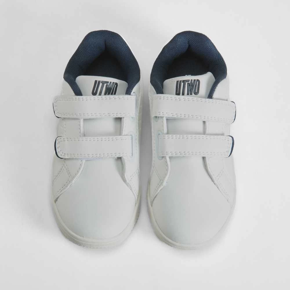 Zapatilla deportiva tenis lisa y funcional de la marca UTWO para niños. Corte de color blanco con dos tiras de velcro ajustables, perforados en el lateral y detalles combinados en azul. TUTW