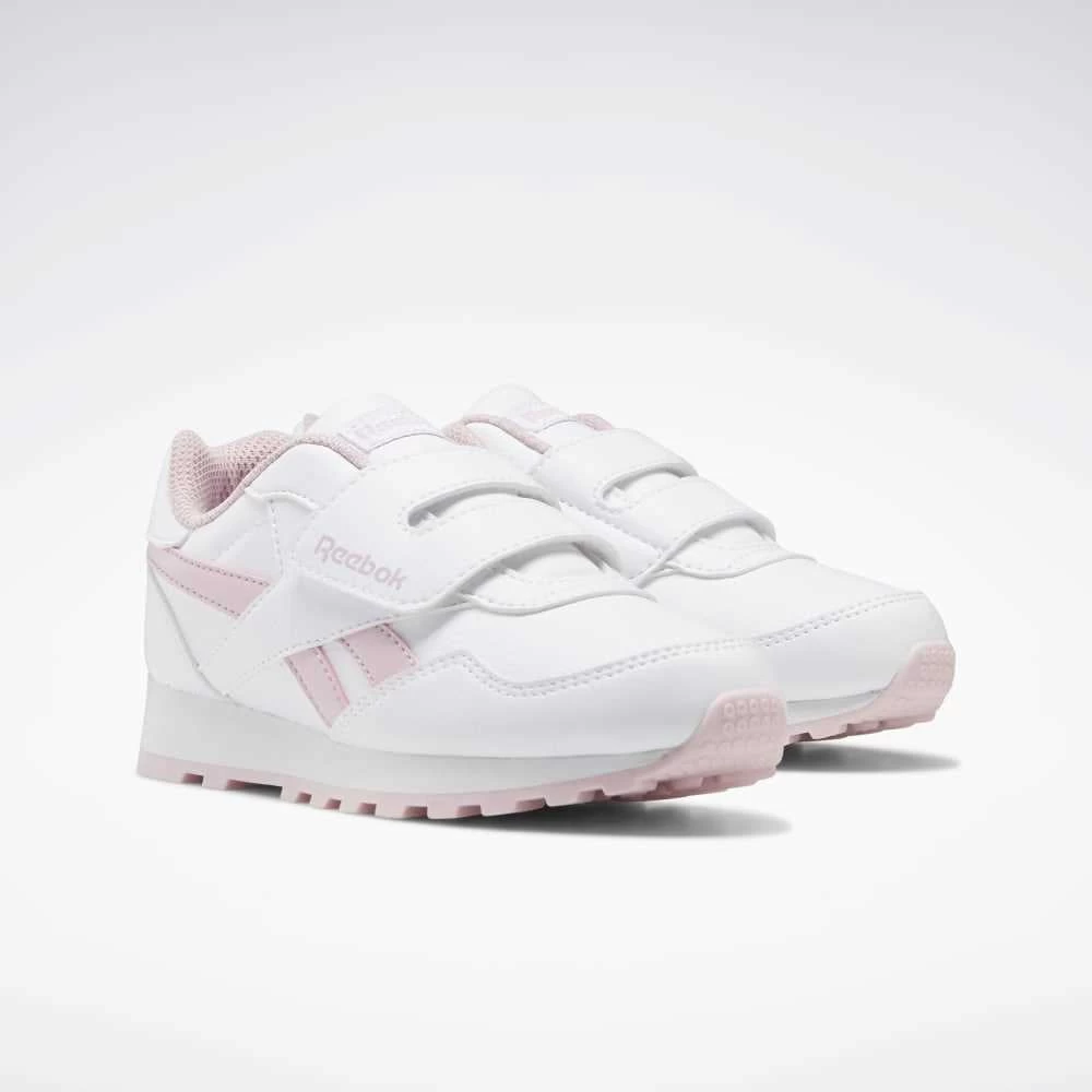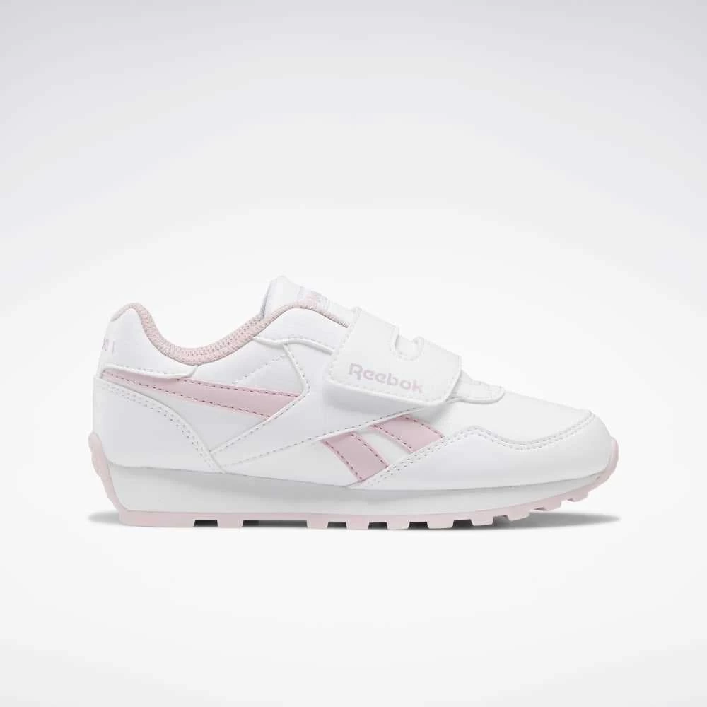 Zapatilla deportiva REEBOK Royal Rewind Run para niños. Modelo en color blanco con detalles en rosa, velcro doble para un mayor ajuste y suela dentada.