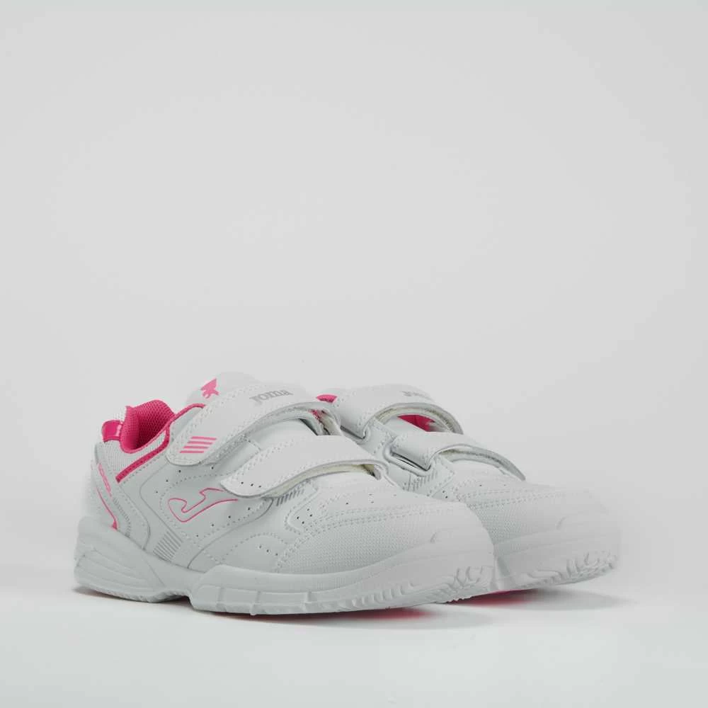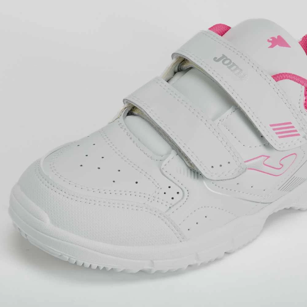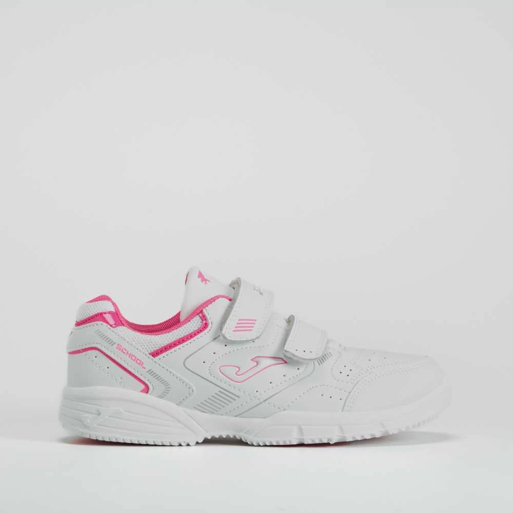 Zapatilla de deporte multiusos JOMA SCHOOL. Modelo en color blanco con detalles combinados en rosa, piezas superpuestas para una mayor resistencia cierre de velcros y puntera reforzada. Suela de goma resistente.