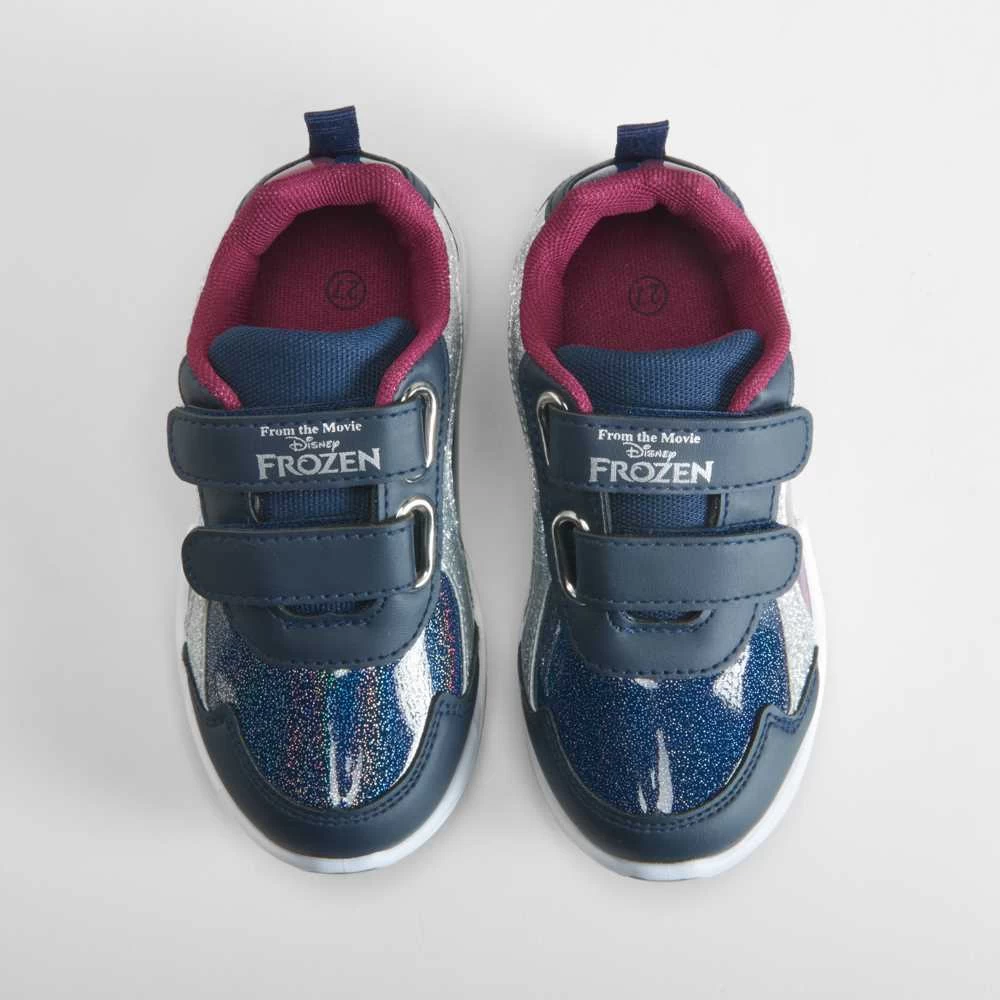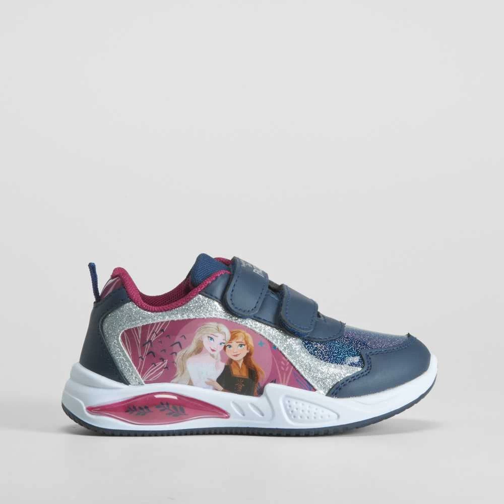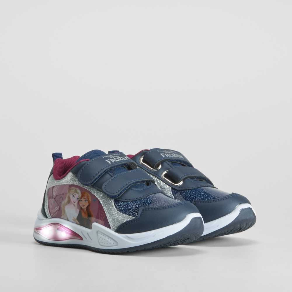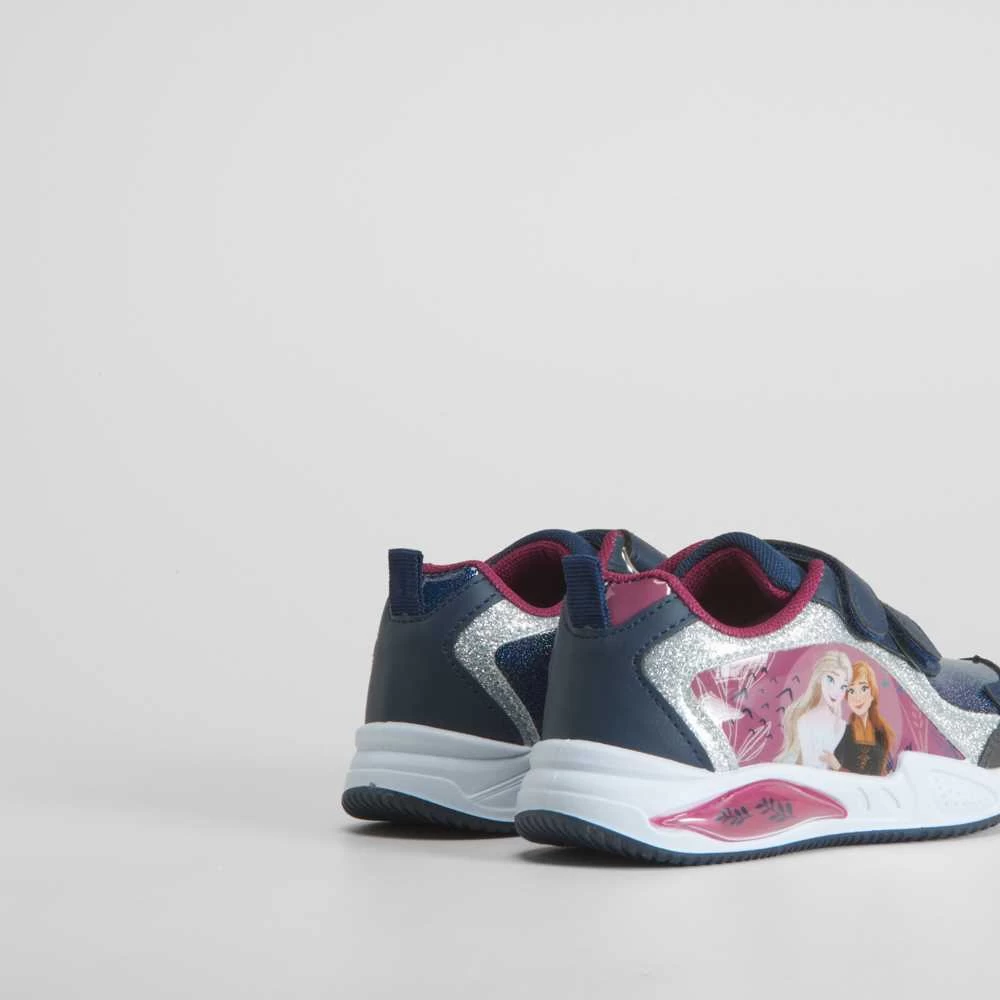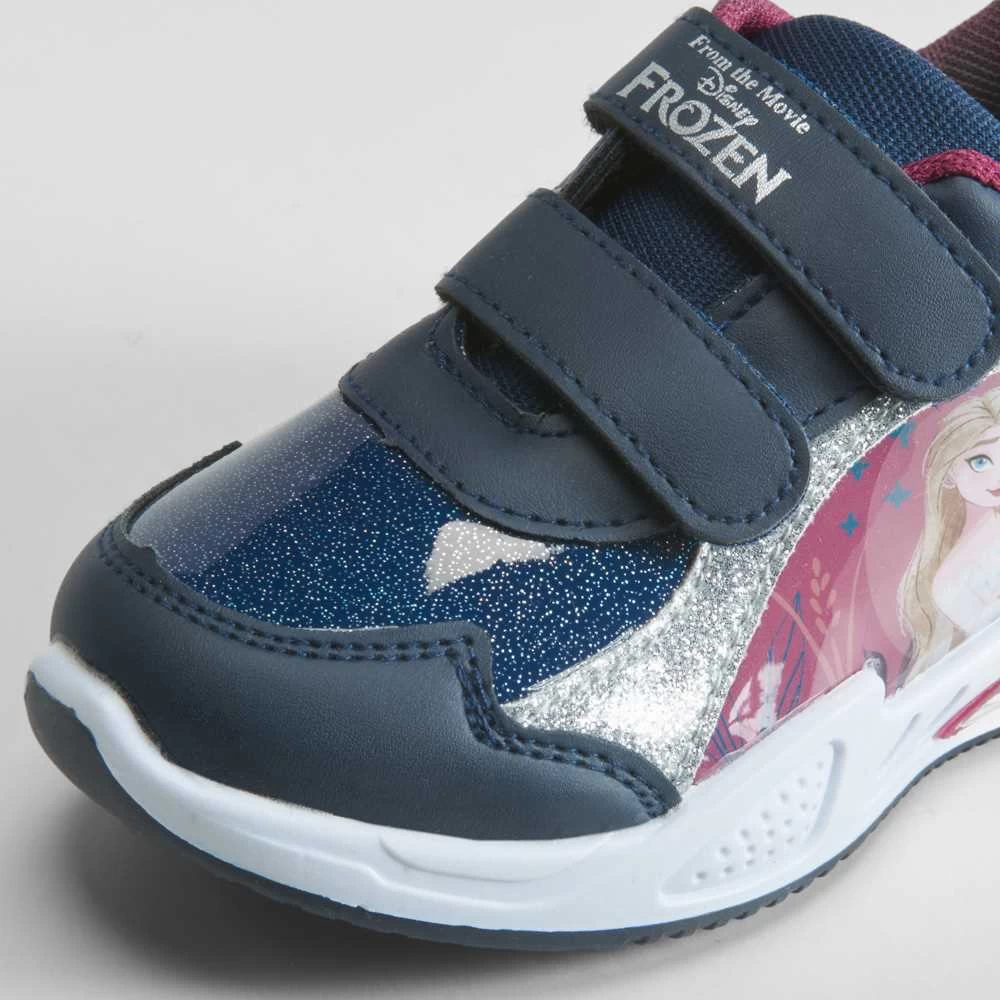Zapatilla deportiva con luces de FROZEN en color azul marino con dos tiras de velcro ajustables.