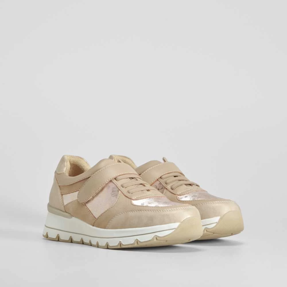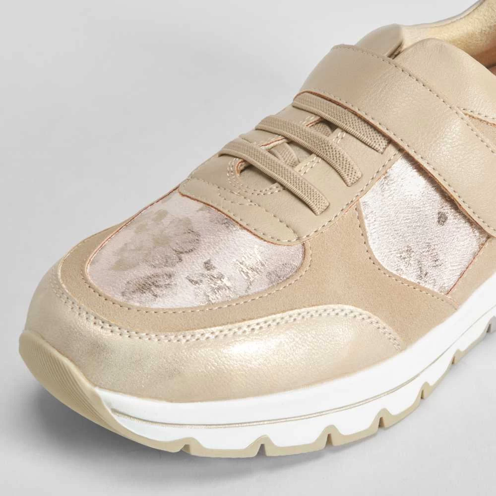 Zapatilla deportiva de COMFEET para mujer en color beige con detalles dorados. Cierre de velcro con cordones elásticos. Tecnología SPHERA GEL: La plantilla perforada proporciona el máximo confort y transpirabilidad gracias a su tecnología de micro esferas de gel. Absorbe impactos.