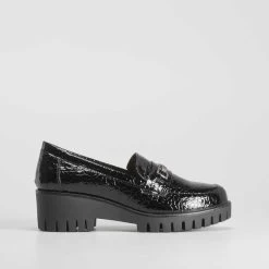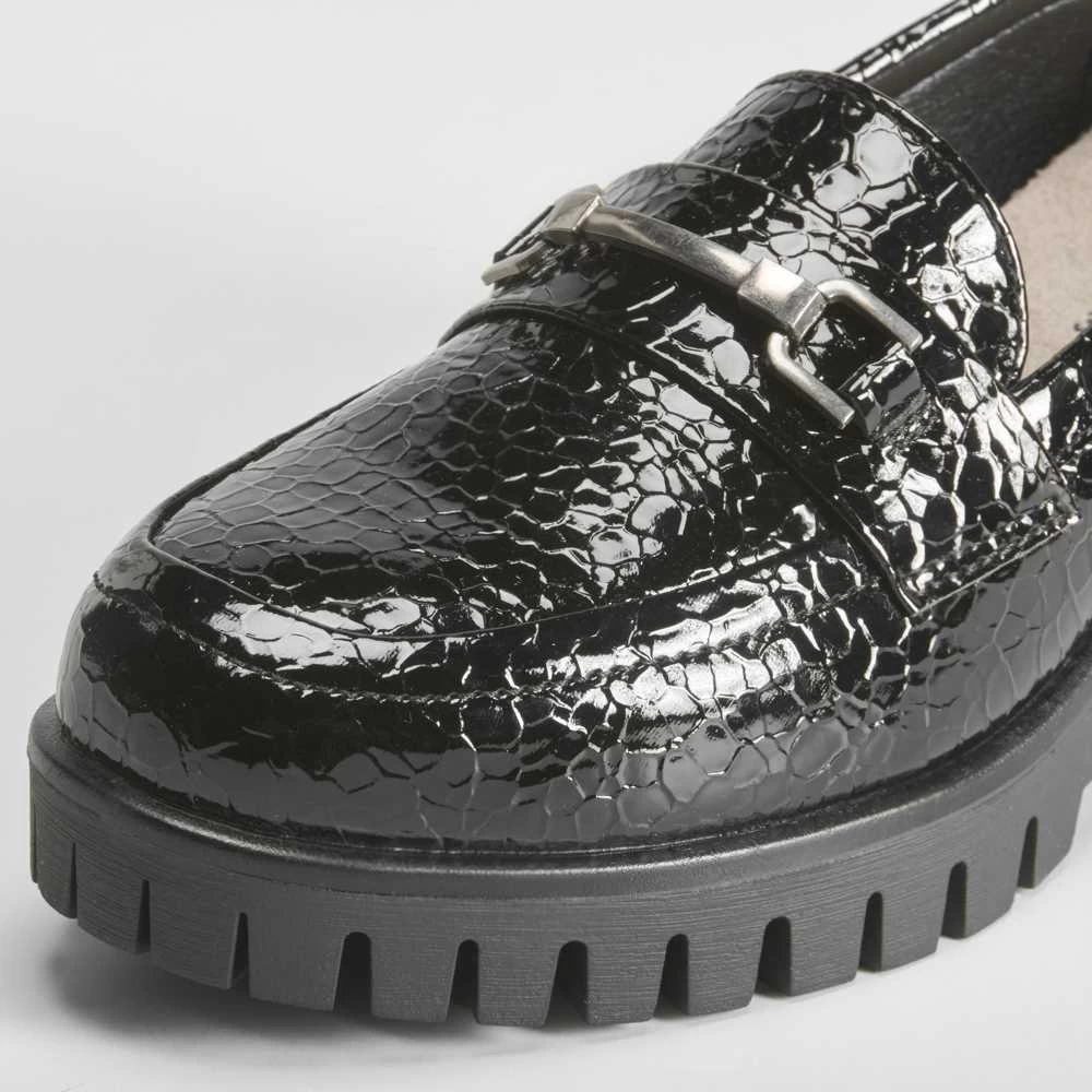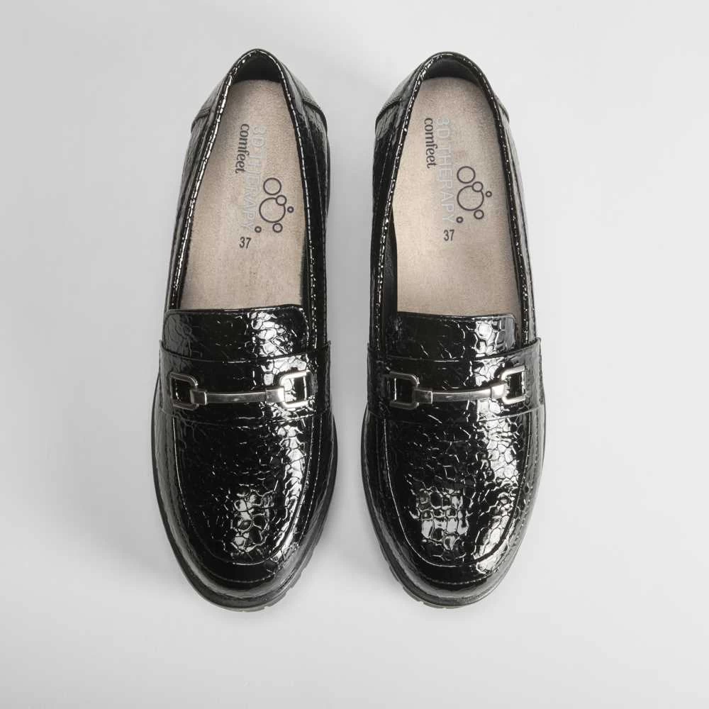 Mocasín de charol en color negro de la marca COMFET. Corte adornado con un estribo en el antifaz y tacón dentado de 5cm de altura. Tecnología 3D Therapy: La plantilla 3D therapy masajea el pie en cada pisada gracias a sus microburbujas, lo que mejora la circulación y aporta suavidad en la pisada.