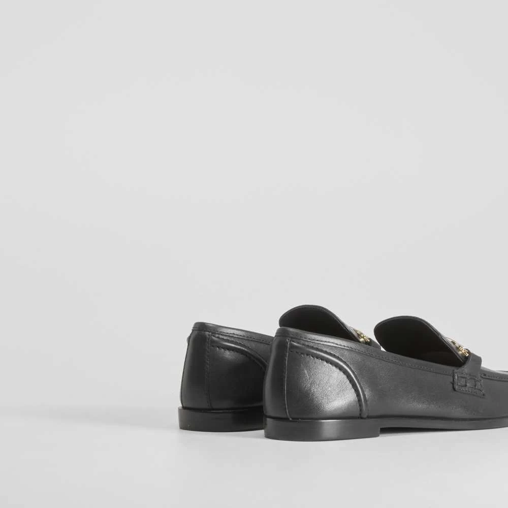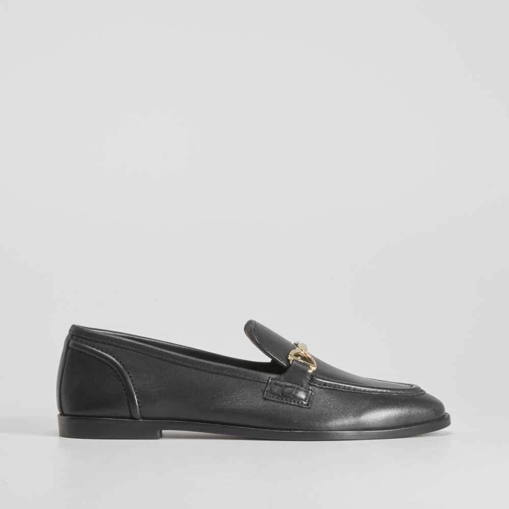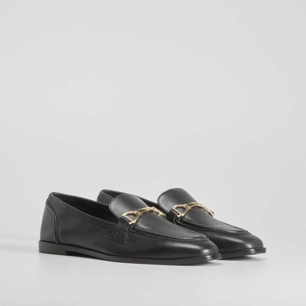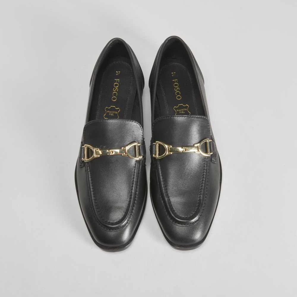 Mocasín plano de piel de la marca FOSCO en color negro con estribo de adorno en el copete.