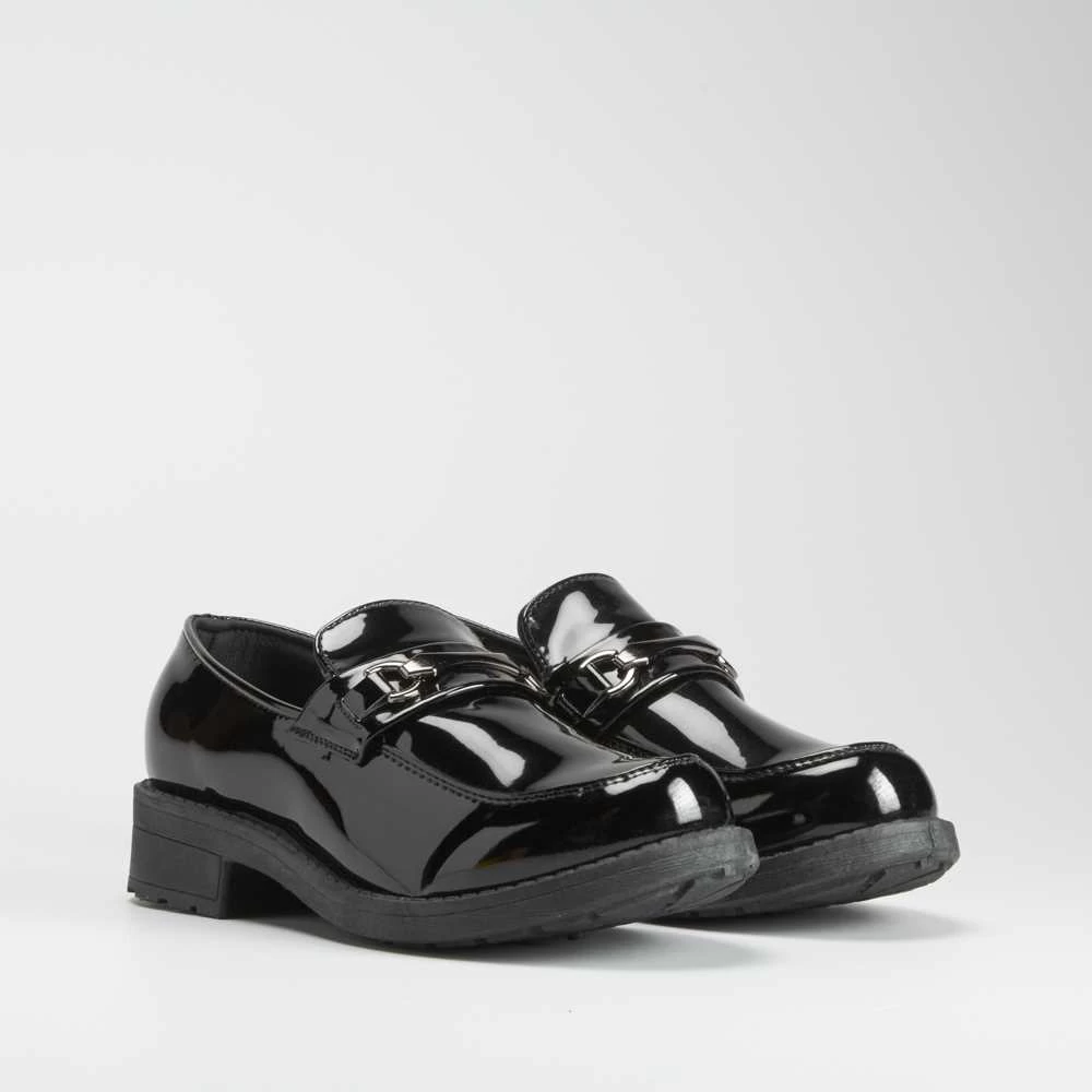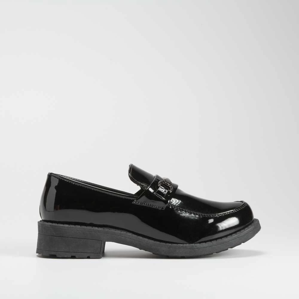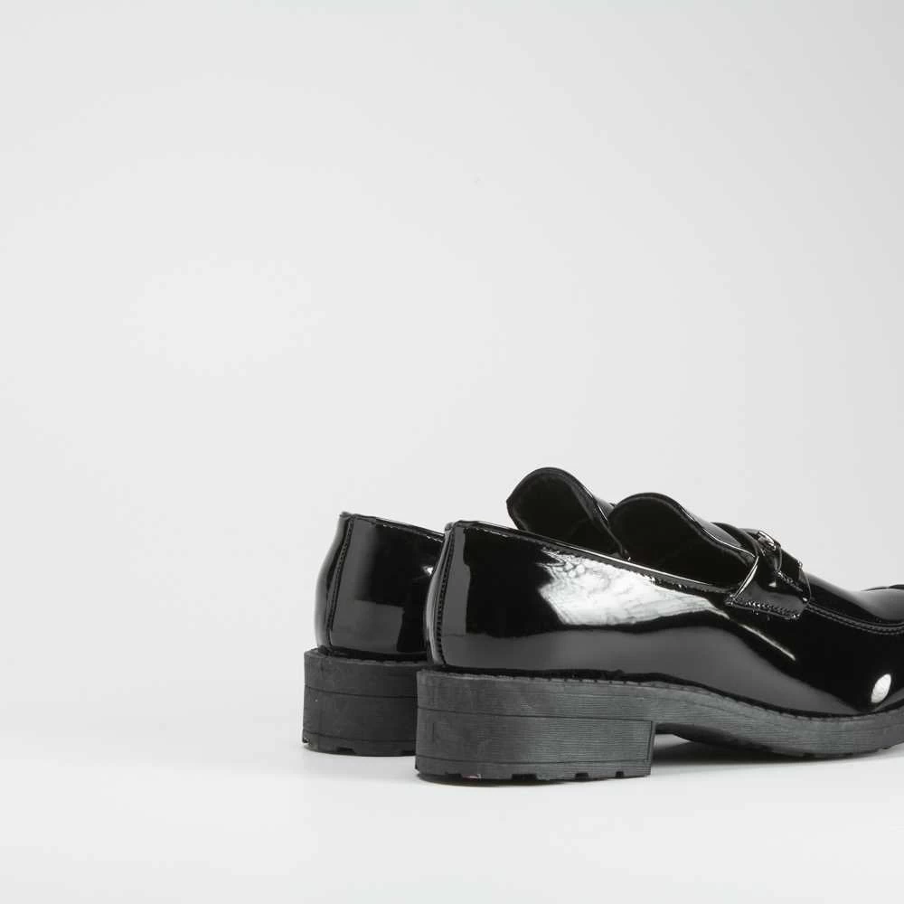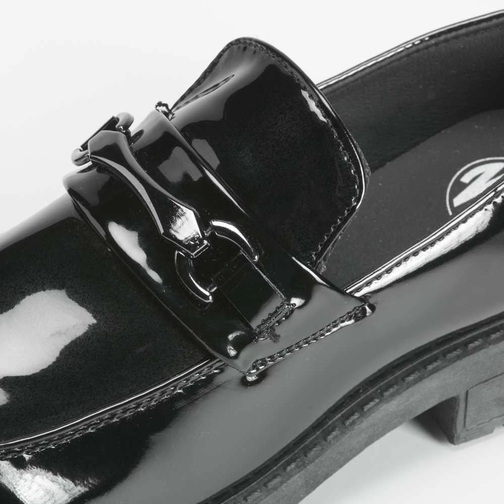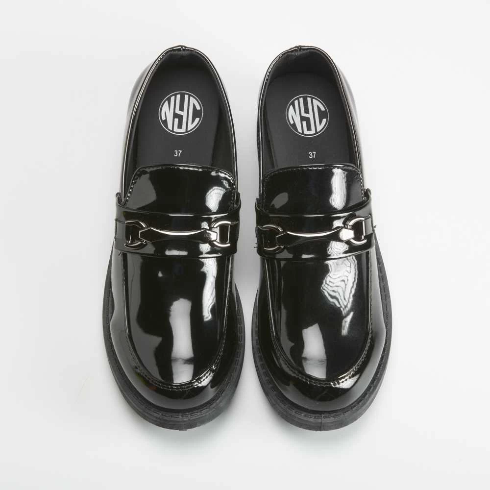 Mocasín para mujer de la marca NYC. Modelo en color negro con cadena decorativa en la parte superior. Suela con ligera cuña combinada..