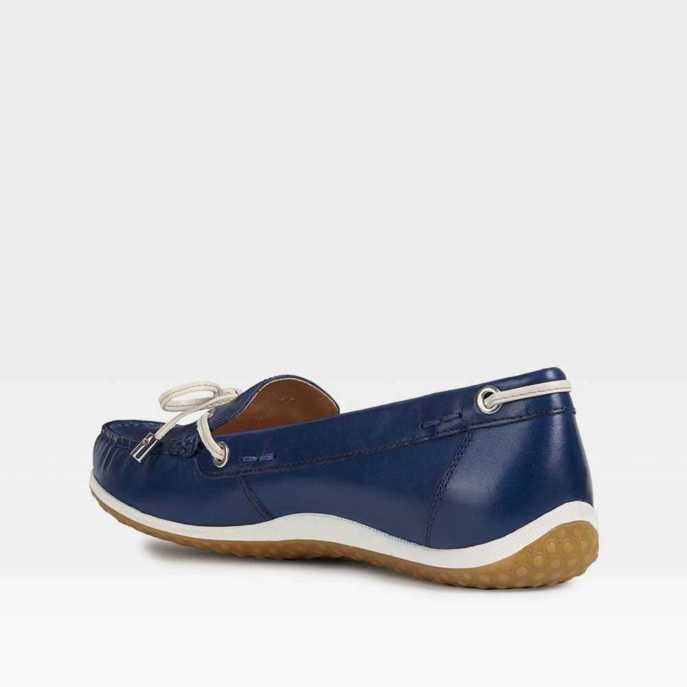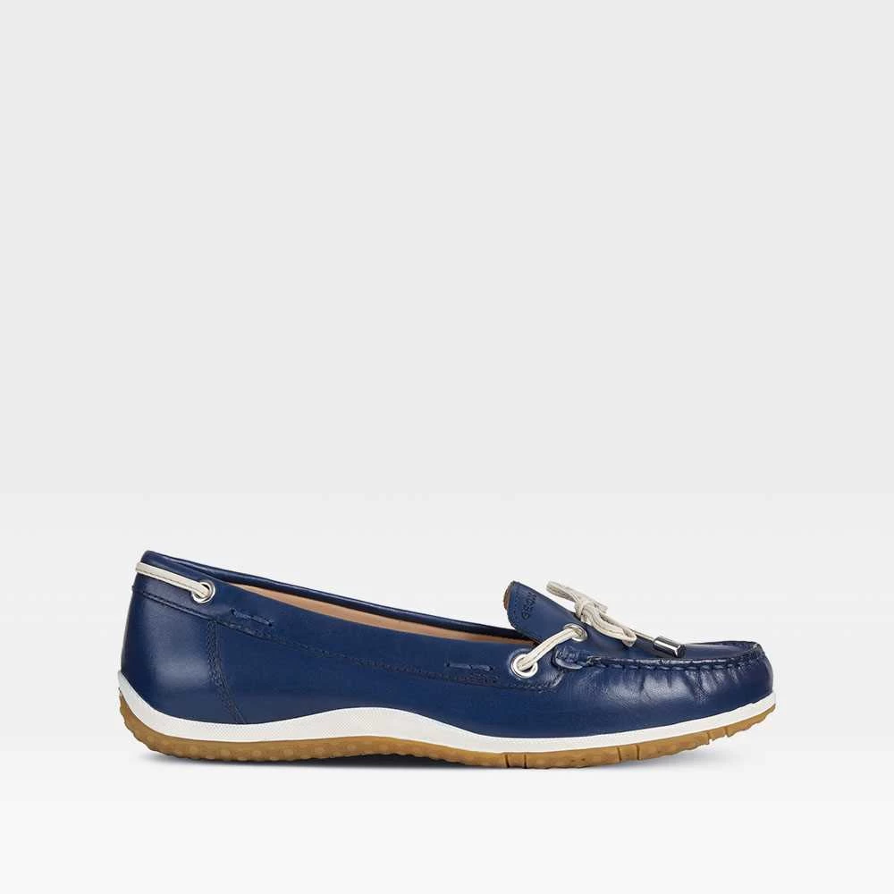 Mocasín plano de piel de la marca GEOX para mujer. Exterior en color azul, con pasados y lazo en color blanco y bordón entonado.