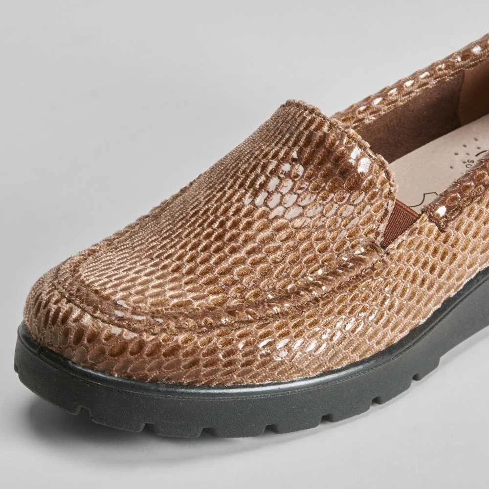 Mocasín plano marrón de la marca COMFEET con un diseño de serpiente. Elásticos laterales para un calce sencillo y diseño extra ancho para mayor comodidad. Tecnología SOFT INSOCK: La plantilla se adapta a la forma natural del pie, aportando una sensación de bienestar al caminar