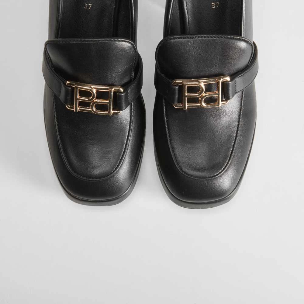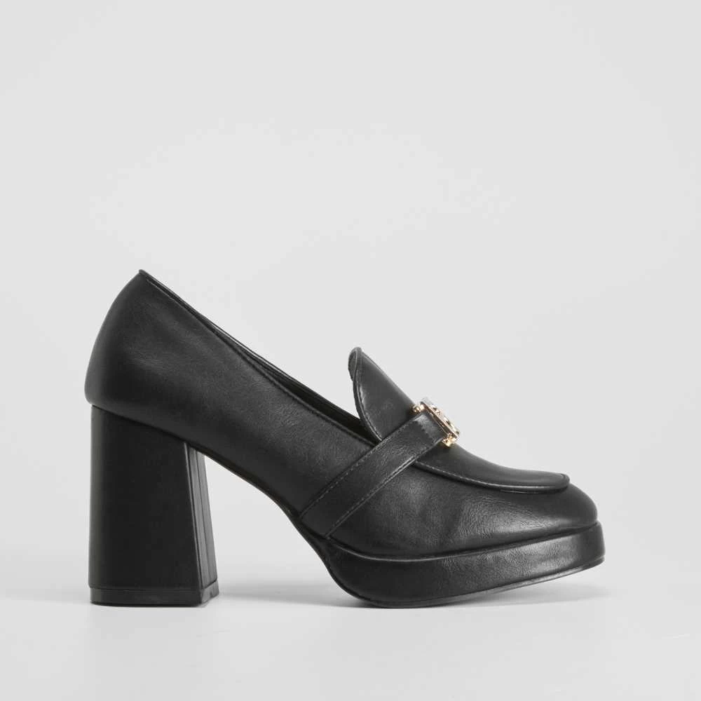 Mocasín negro de tacón alto de PICCOLA PIU para mujer. Corte adornado con estribo metálico en el copete. Tacón de 9cm de altura.