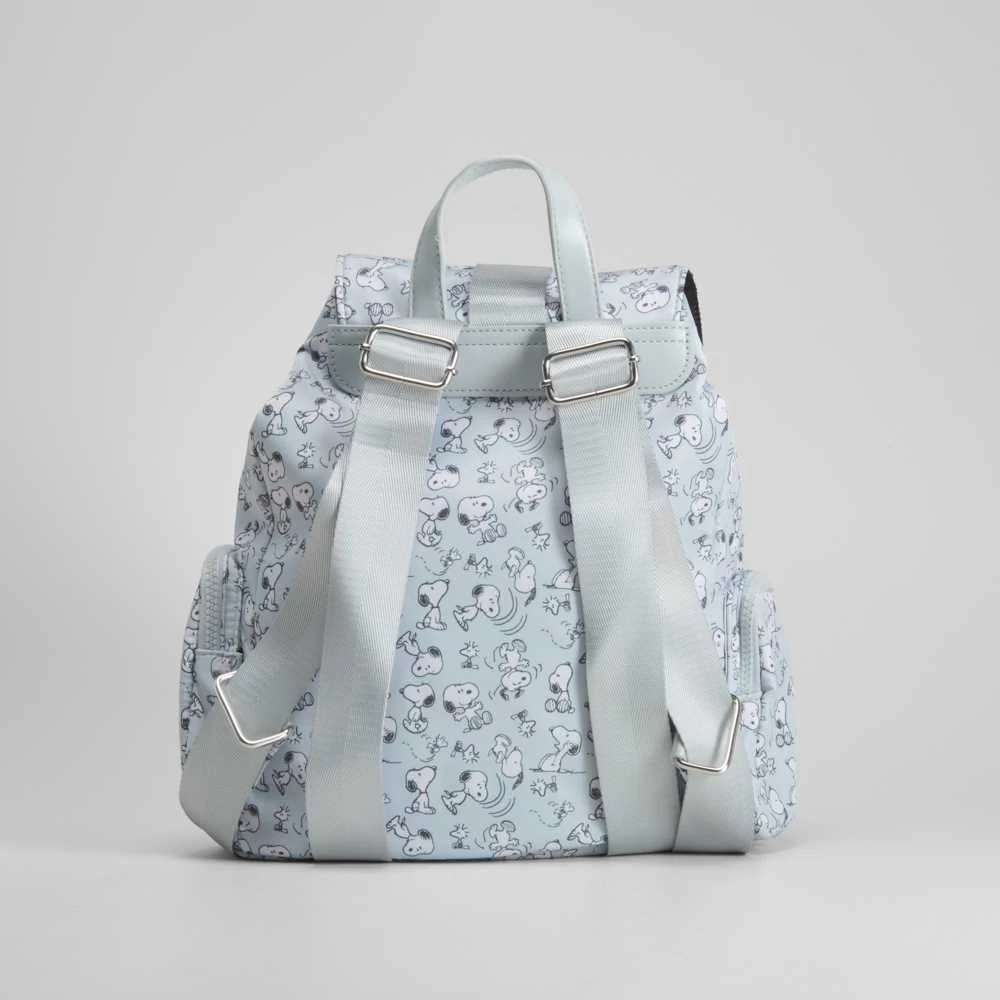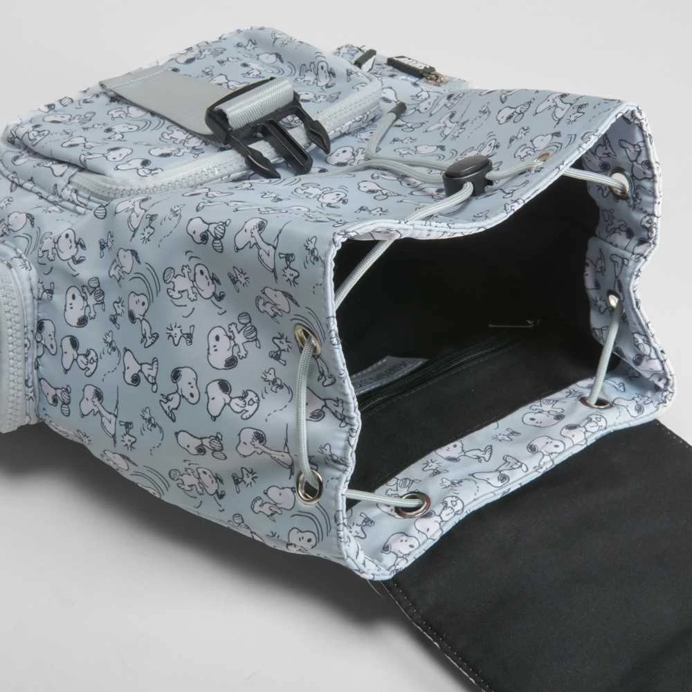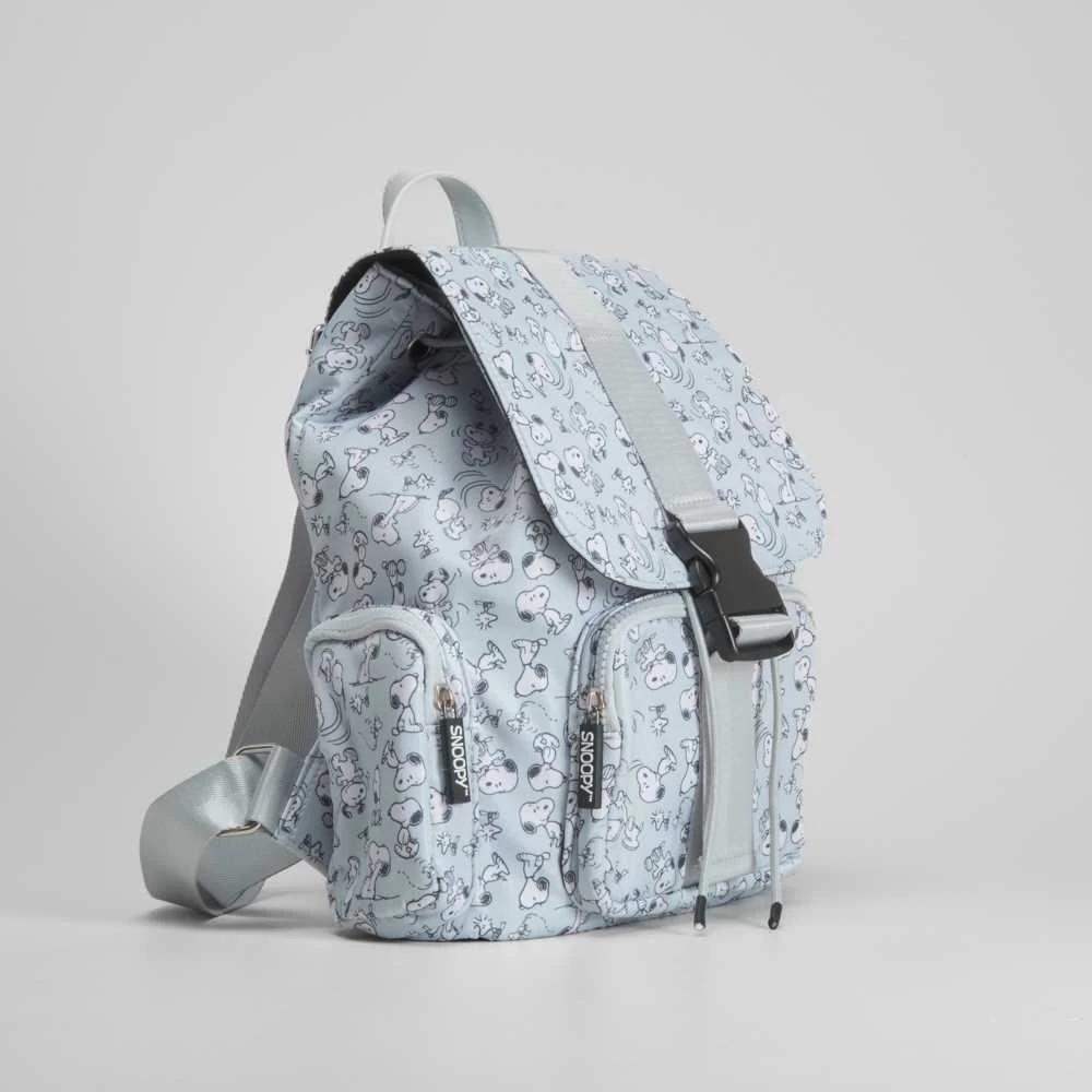 Mochila de SNOOPY en color azul adornada con estampados. Compartimento con solapa con cierre de clip y correa ajustable. Incorpora además 3 bolsillos con cremallera a los laterales y en la parte frontal.