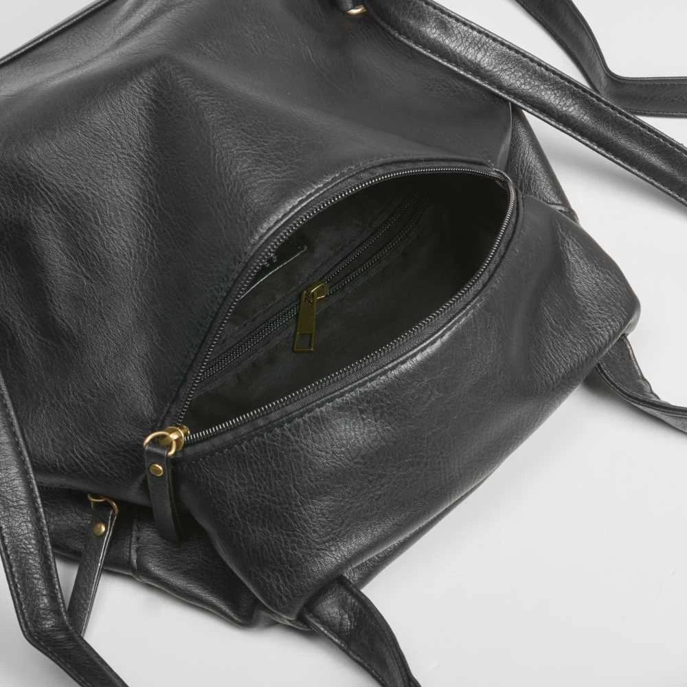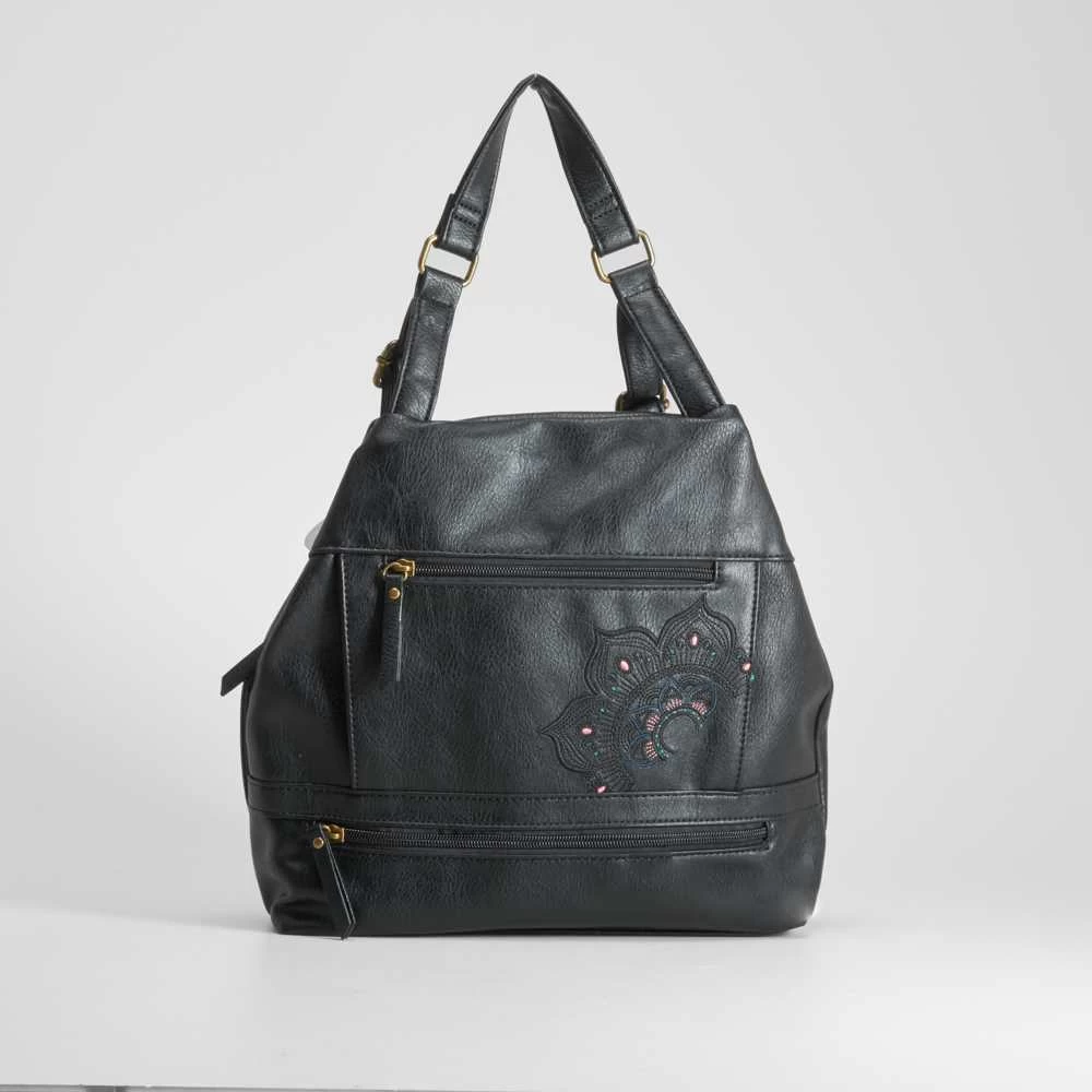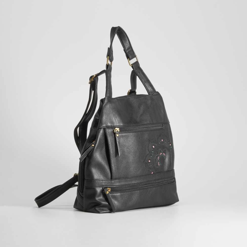 Mochila negra con cremallera y flor bordada de la marca SENDA ROAD. Modelo muy funcional con cuatro compartimentos exteriores y asas ajustables.