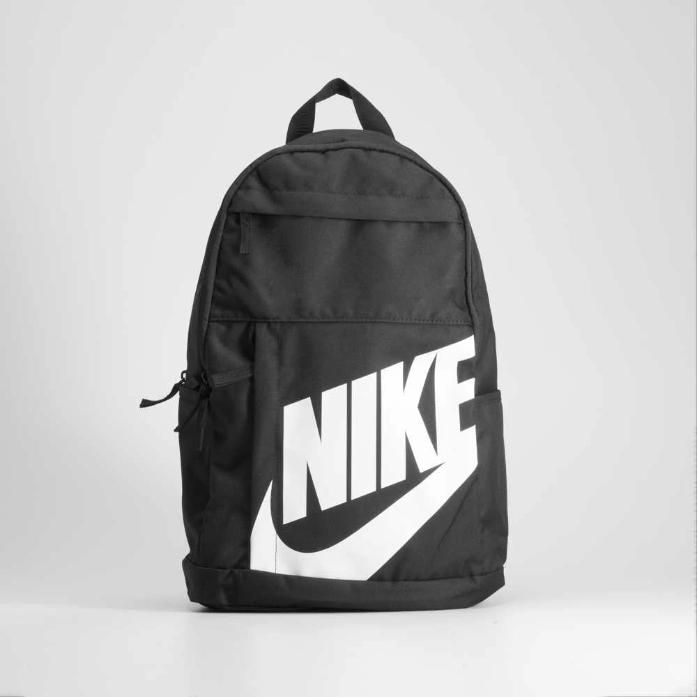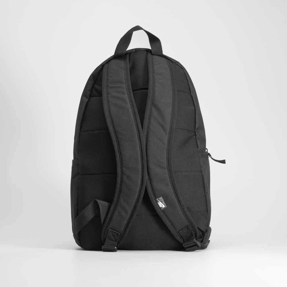 Mochila negra de nylon de NIKE con el logo blanco y cierre de cremallera.