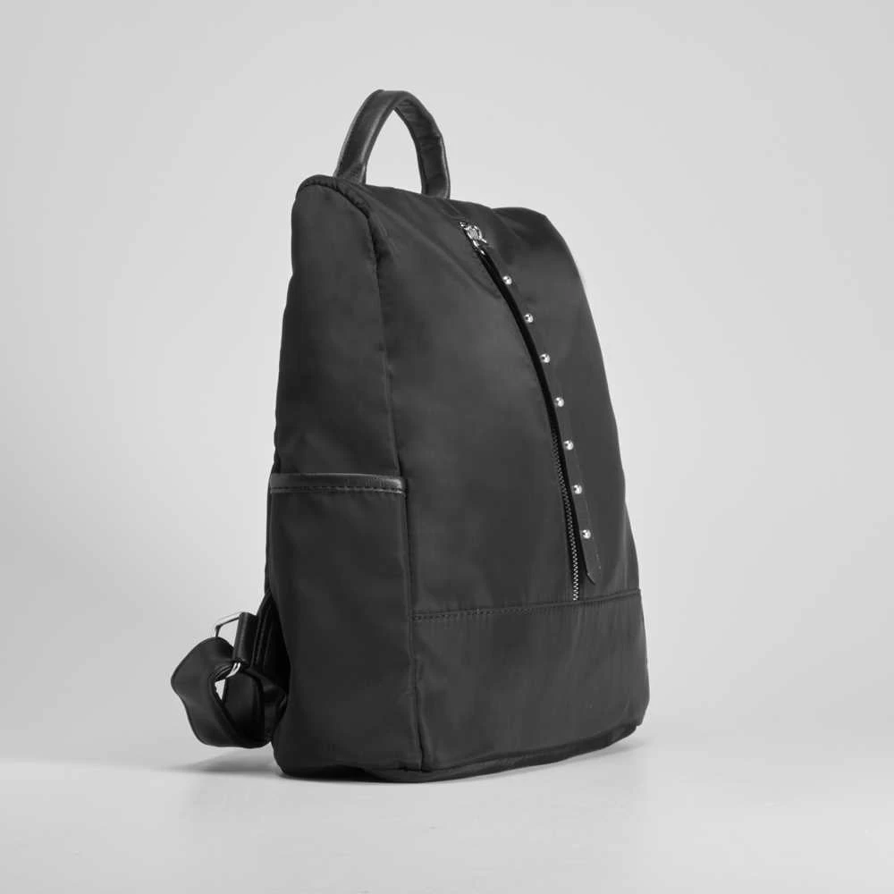 Mochila de nylon de la marca SENDA ROAD. Modelo con fleco decorativo contrastado en color negro, cierre trasero de cremallera y doble asa ajustable. Medidas: 29 x 12.5 x 34cm.