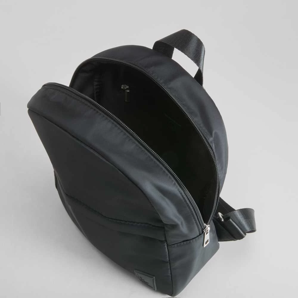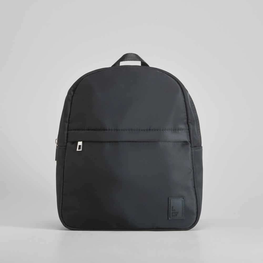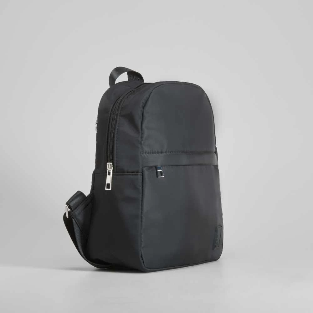 Mochila de nylon lisa y sencilla de la marca NYC. Bolsillo delantero y compartimento principal con cierre de cremallera. Interior amplio con un bolsillo. Asas traseros ajustables.