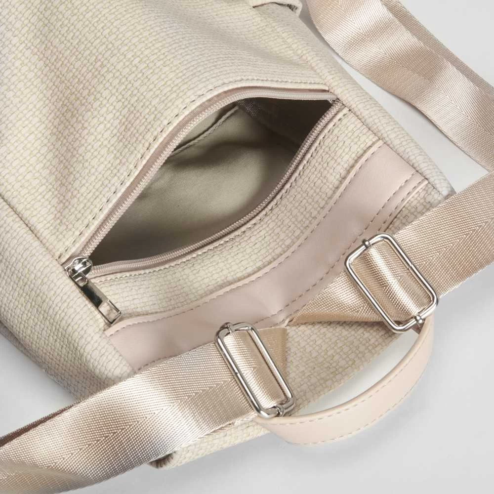Mochila beige para mujer de SENDA ROAD con un acabado engomado. Este modelo dispone de un bolsillo delantero y trasero con cremallera y amplio interior y dos más pequeños en los laterales. Asas de nylon ajustables.