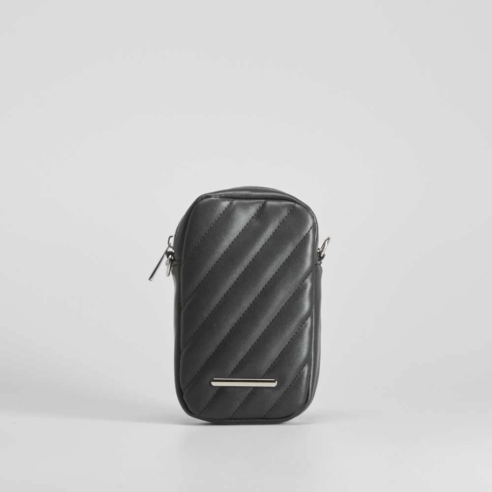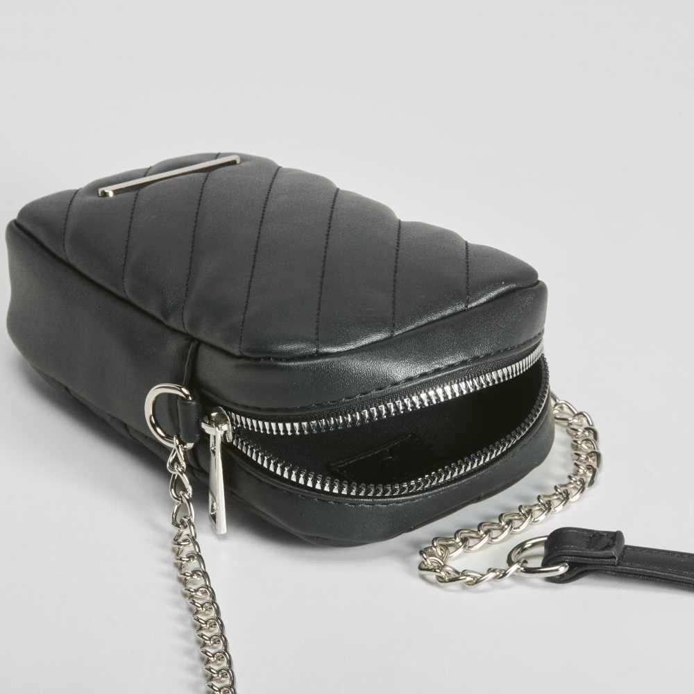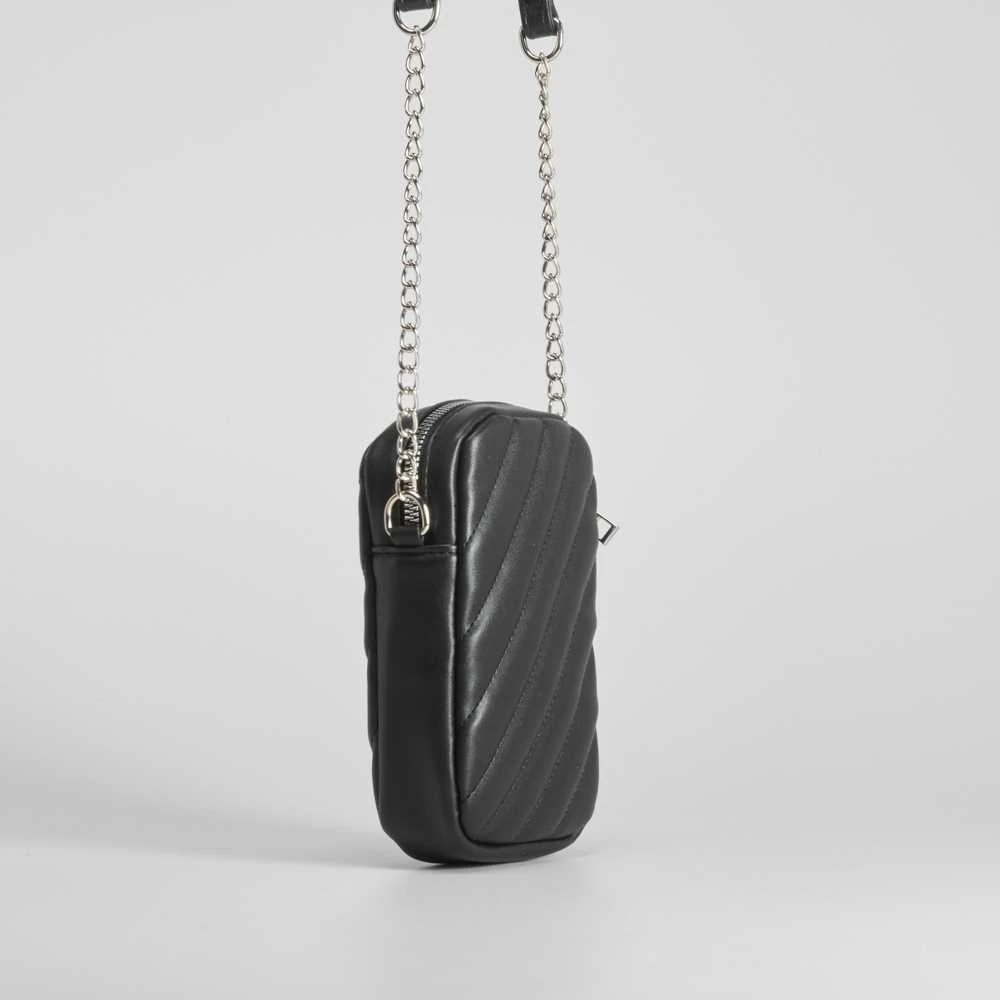 Porta móvil con acolchado diagonal de la marca NYC. Modelo en negro con compartimento con cremallera y asa combinada con eslabones metálicos.