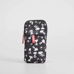 Porta móviles negro de SNOOPY estampado con dos compartimentos con cremallera y correa bicolor ajustable.