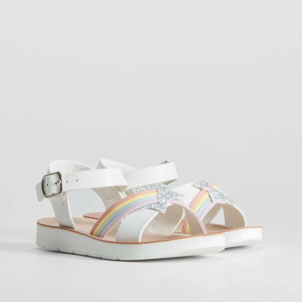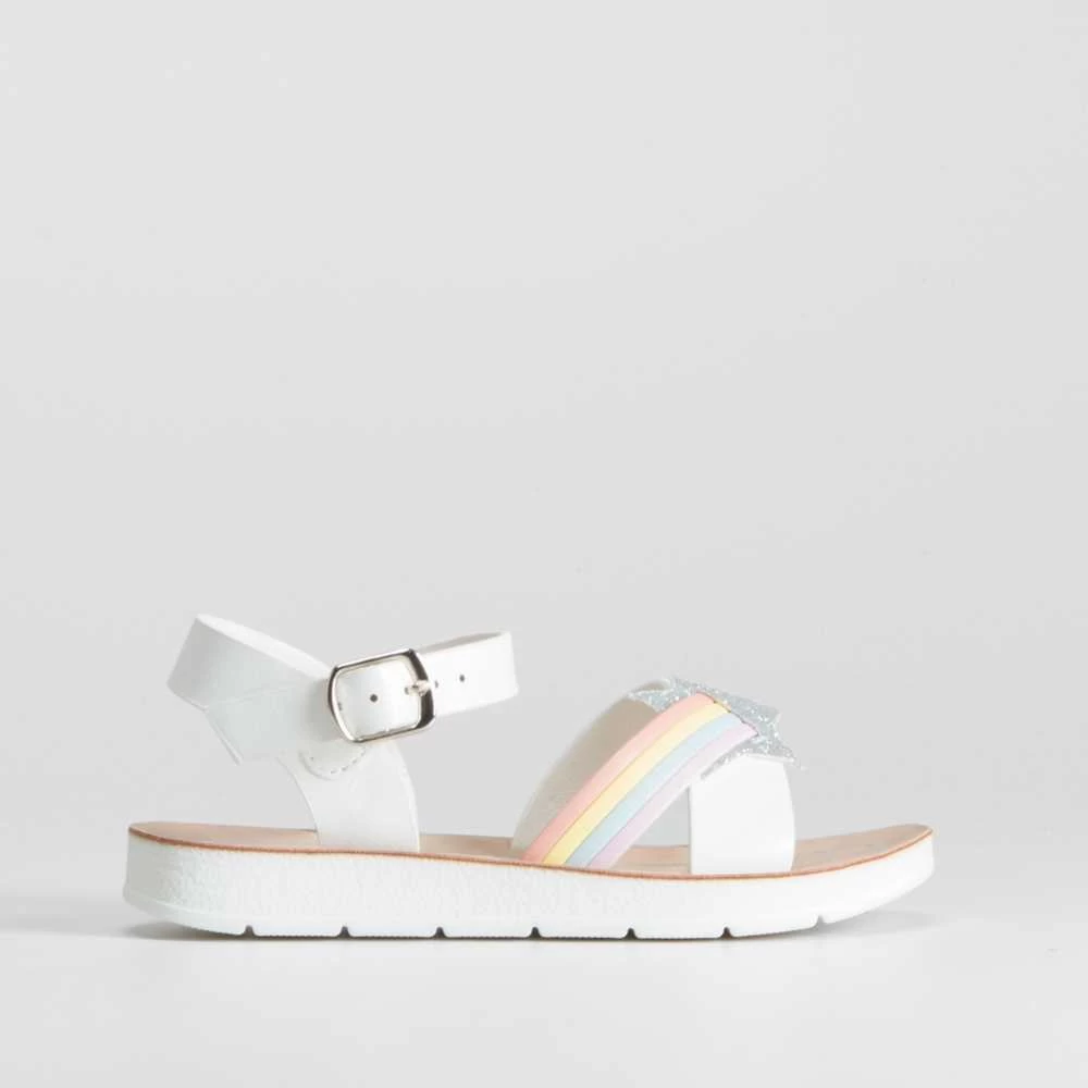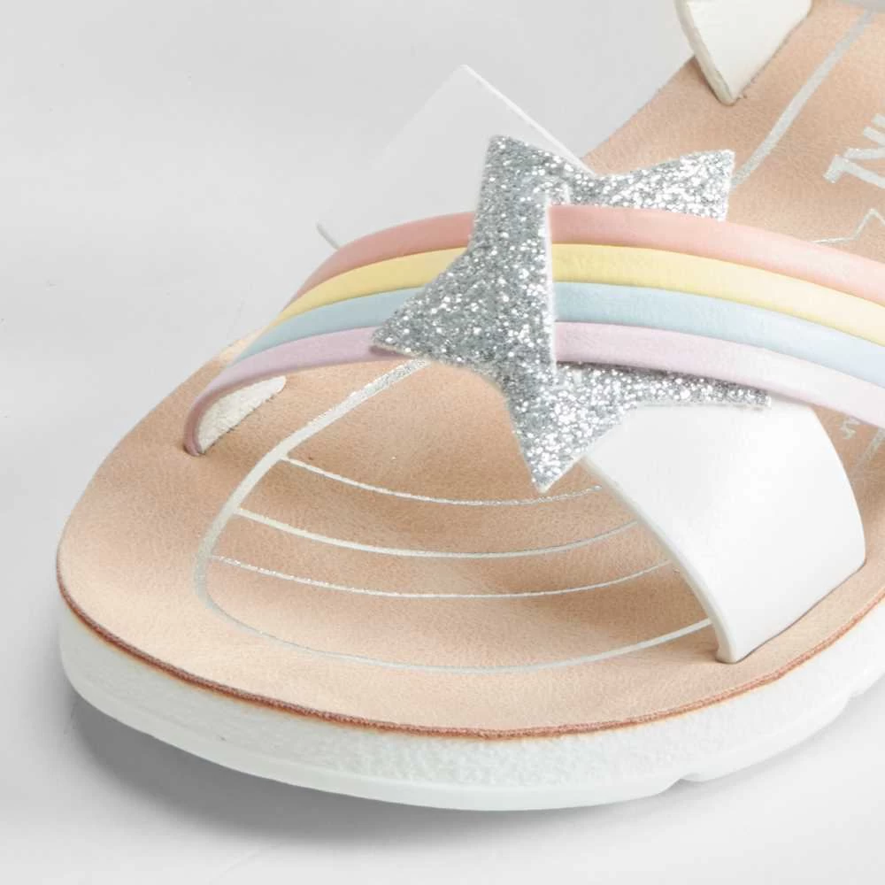 Sandalia multicolor y fantasía de la marca OH GIRL para niñas. Modelo en color blanco con pala cruzada multicolor y adornada con una estrella de glitter. Pulsera con cierre de hebilla.