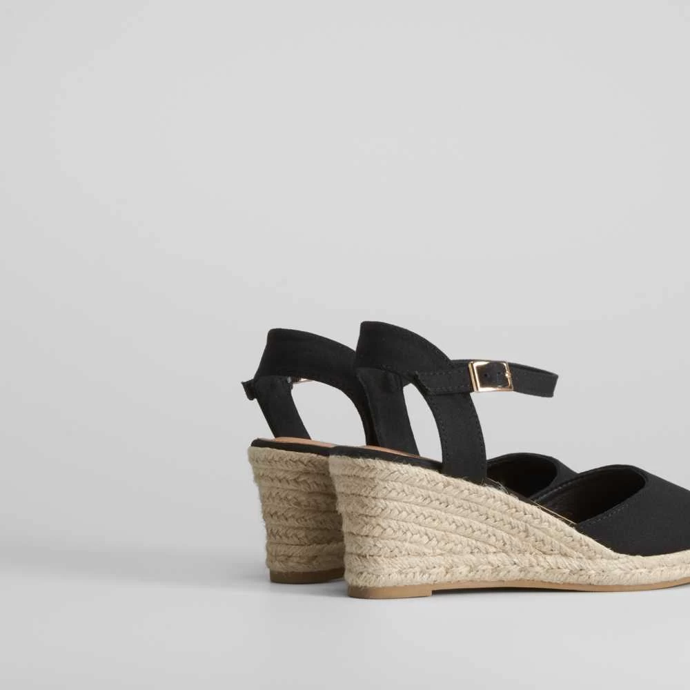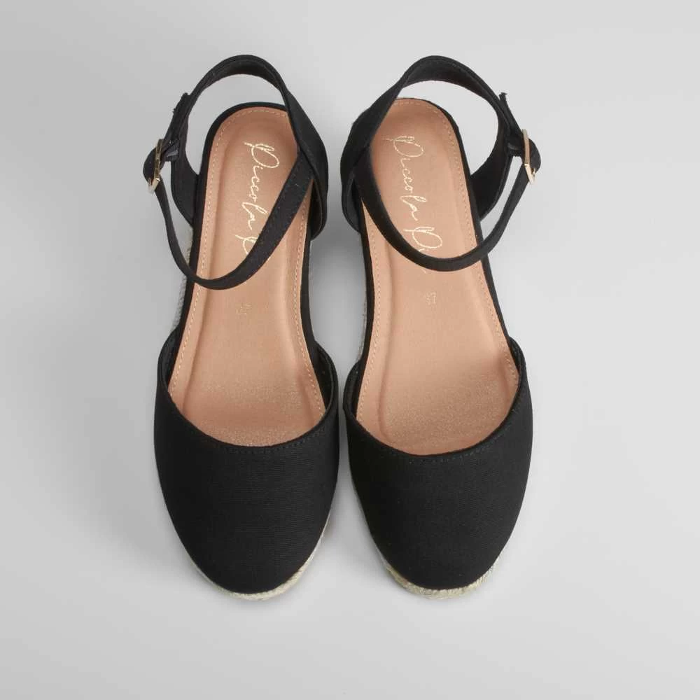 Sandalia para mujer de la marca PICCOLA PIU. Modelo en color negro con pulsera y hebilla trasera ajustable. Suela de yute con cuña de 5cm.