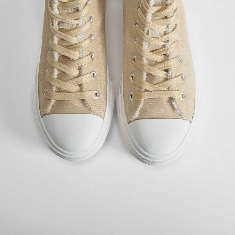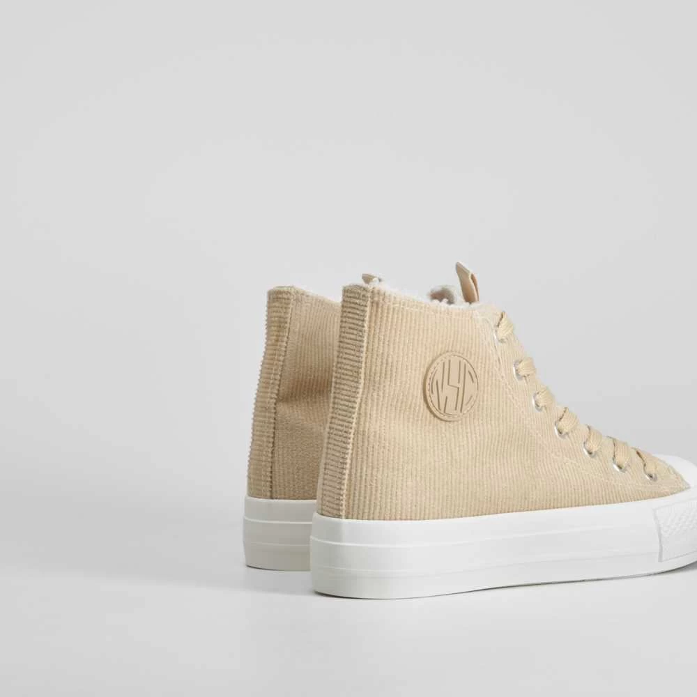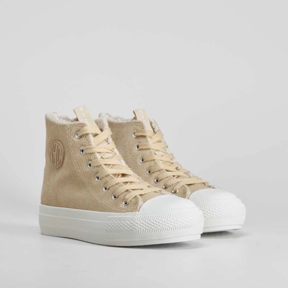 Zapatilla alta de pana para mujer de la marca NYC en color beige. Cierre de cordones, puntera de caucho e interior forrado.