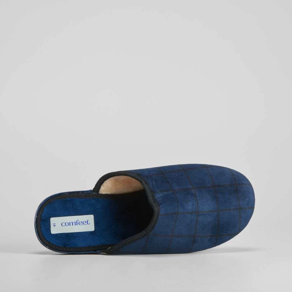 Zapatilla de estar en casa destalonada para hombre con estampado de cuadros en tonos azul. Hecho en España.