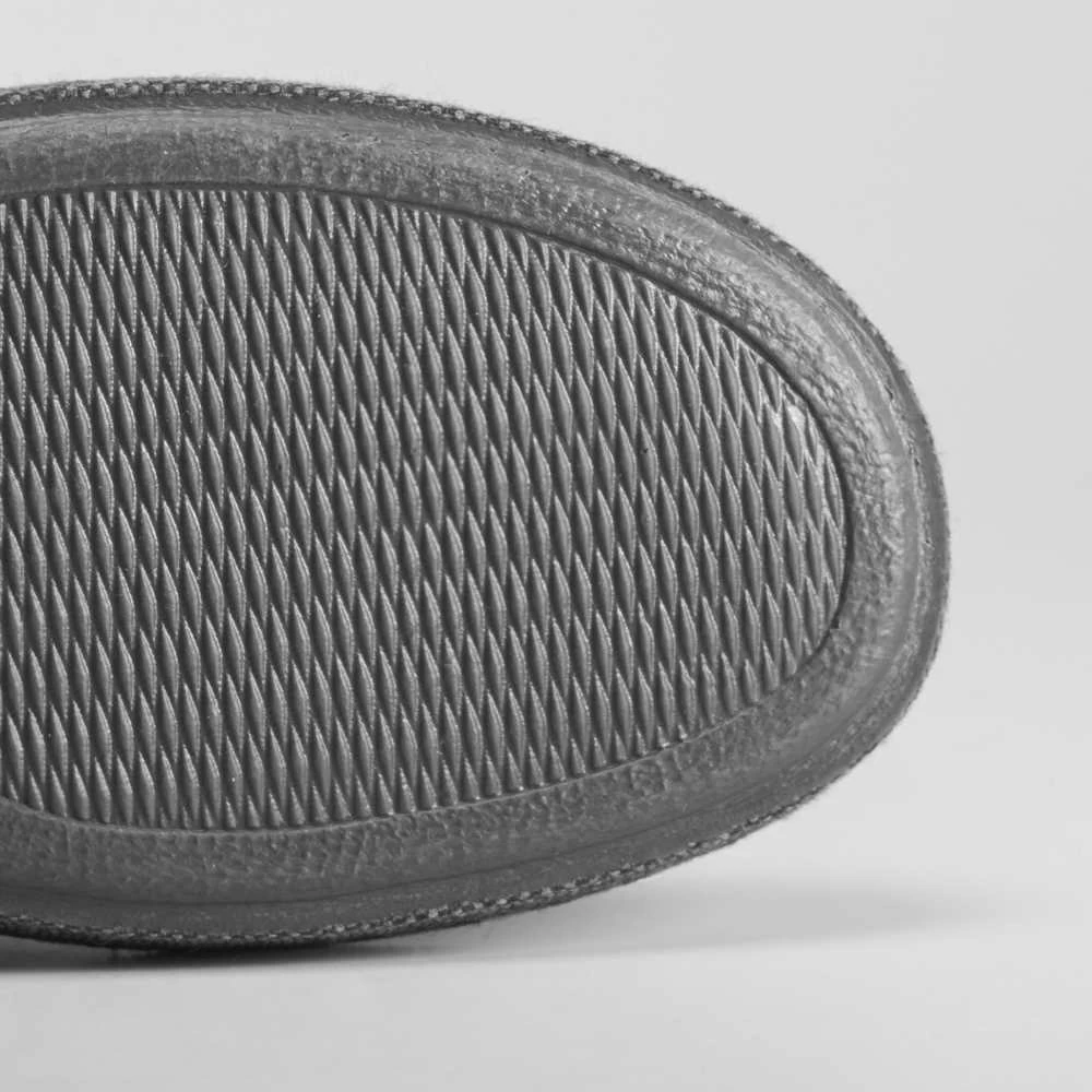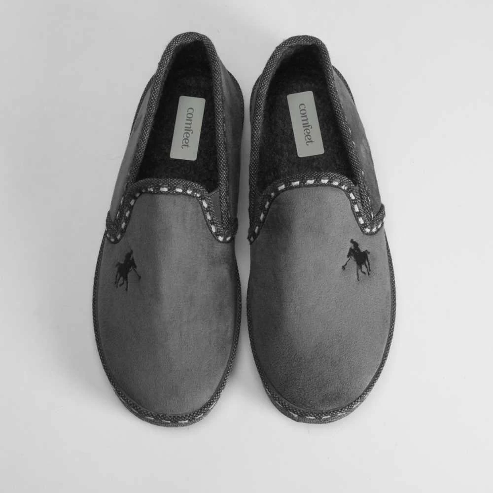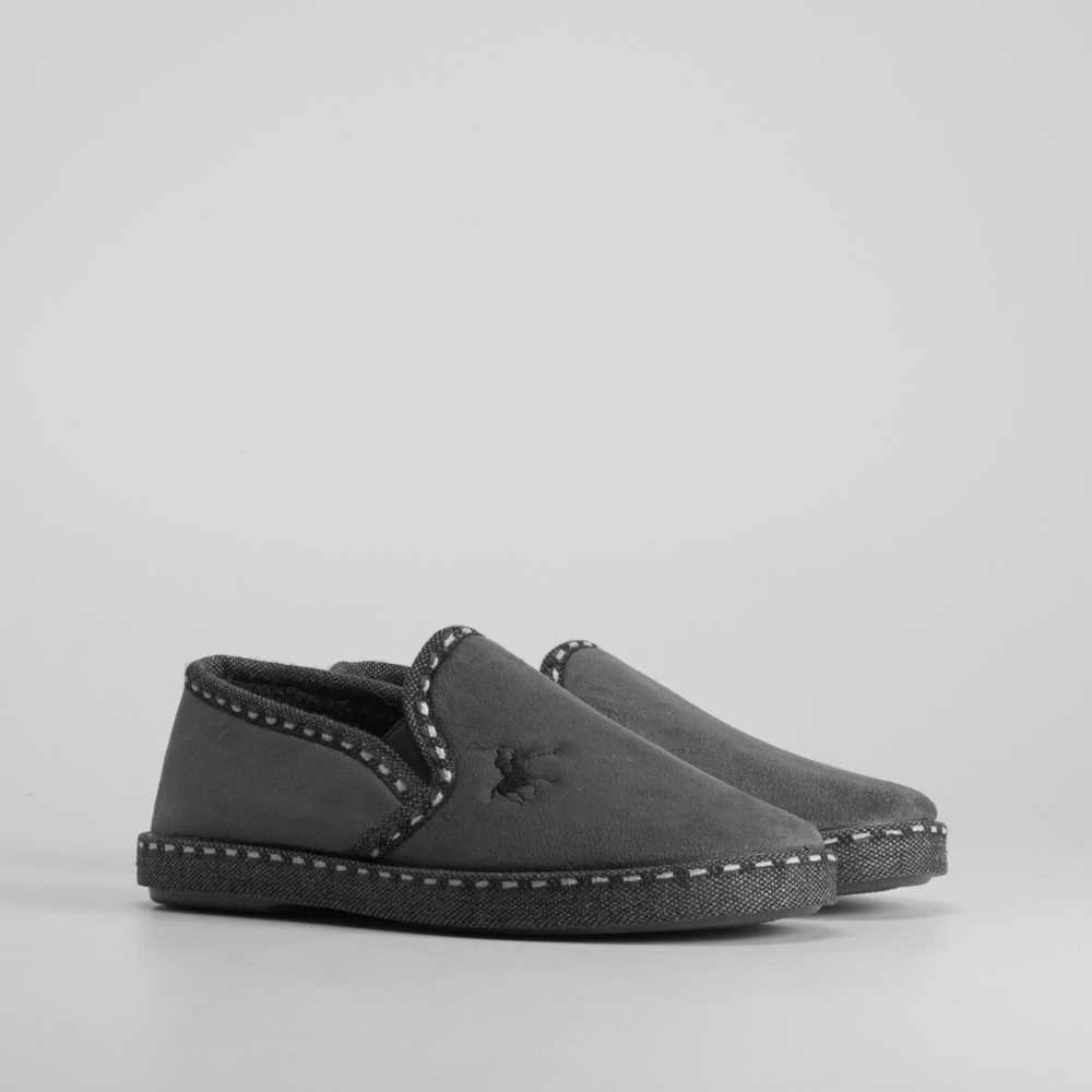 Zapatilla de casa cerrada de color gris de la marca OLYNE. Exterior textil con un bordado en la pala y piso de goma flexible. Hecho en España.