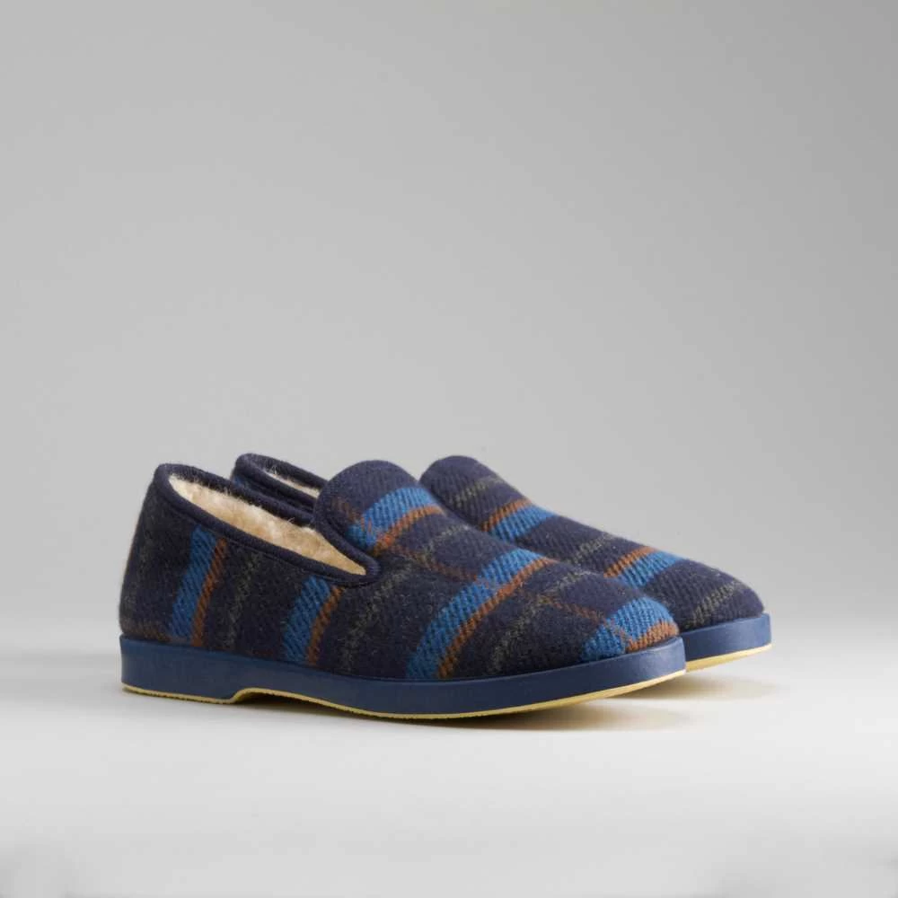 Zapatilla de casa cerrada con diseño clásico y muy agradable de la marca OLYNE. Exterior textil con estampado a cuadros e interior forrado en lana. Suela de goma flexible. Hecho en España.