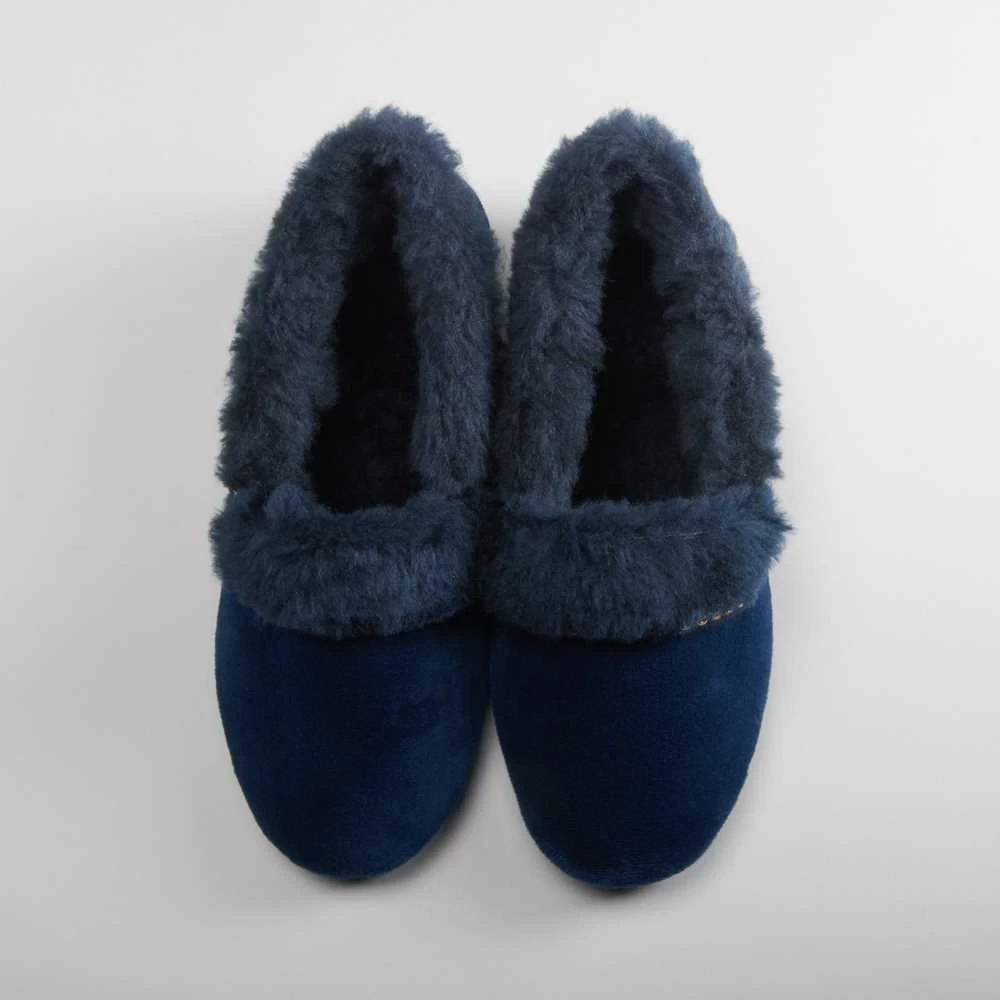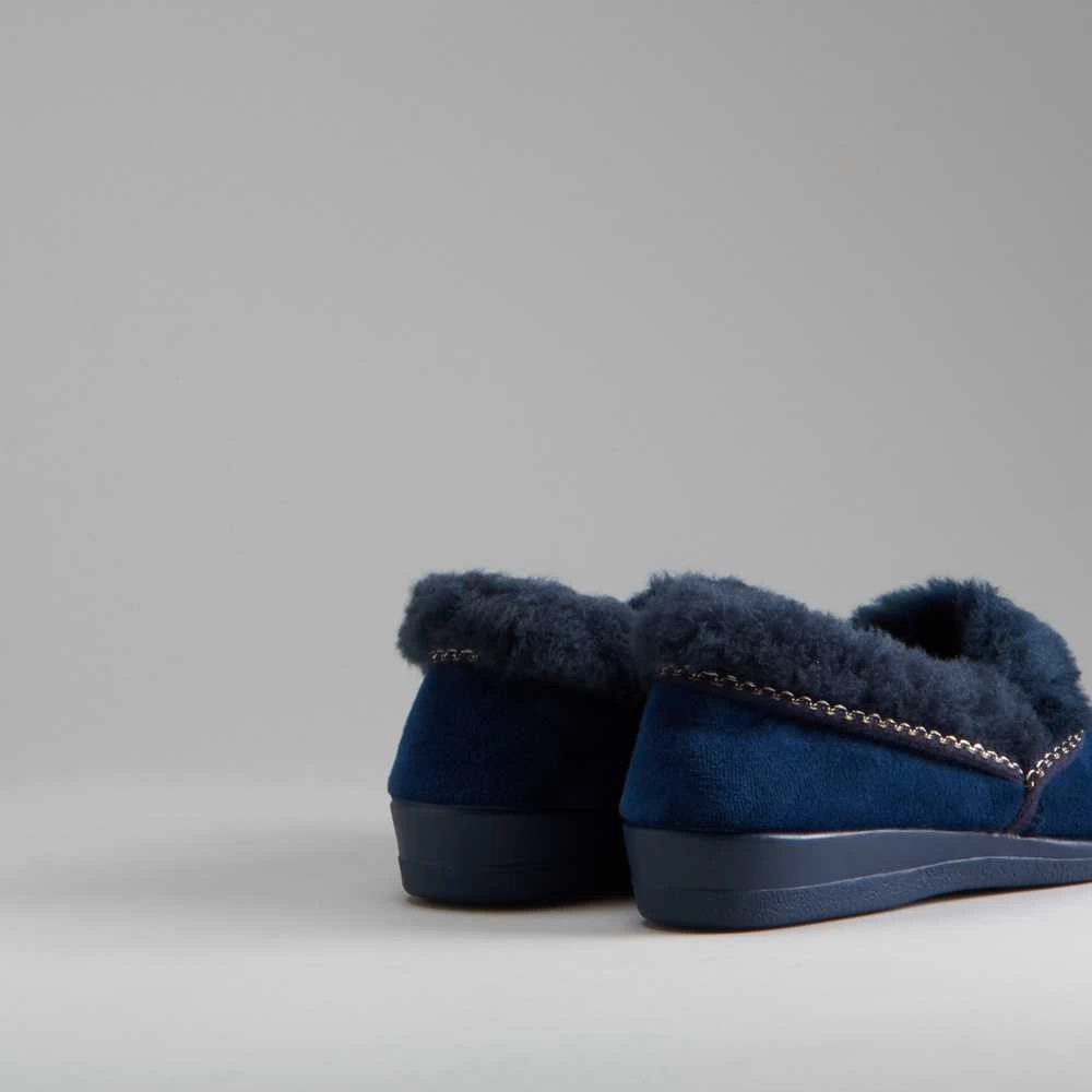 Zapatilla de casa cerrada con el cuello vuelto de la marca OLYNE. Exterior en color azul e interior forrado muy cálido. Hecho en España.