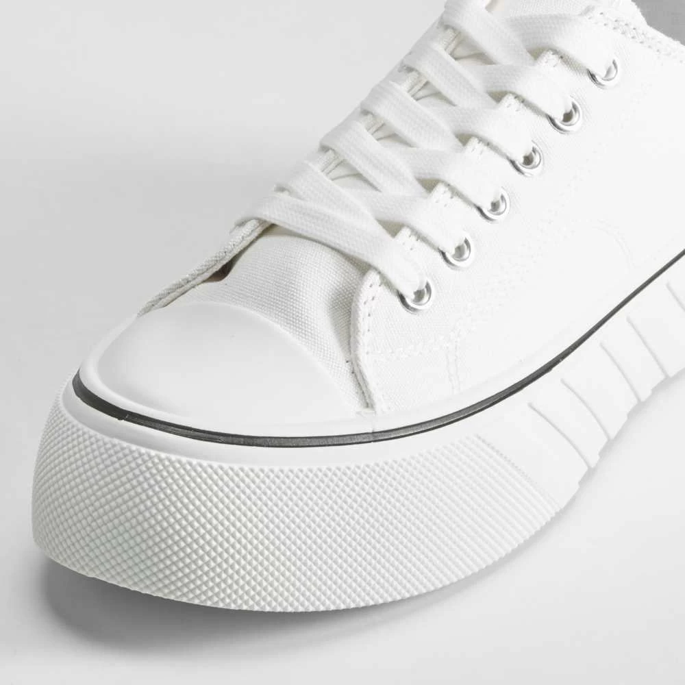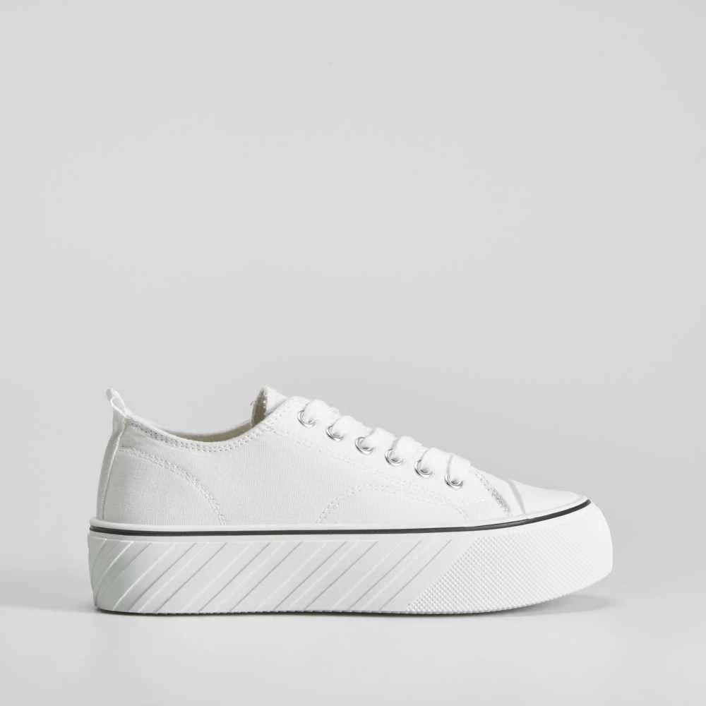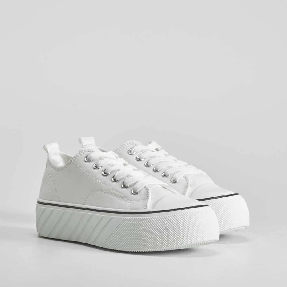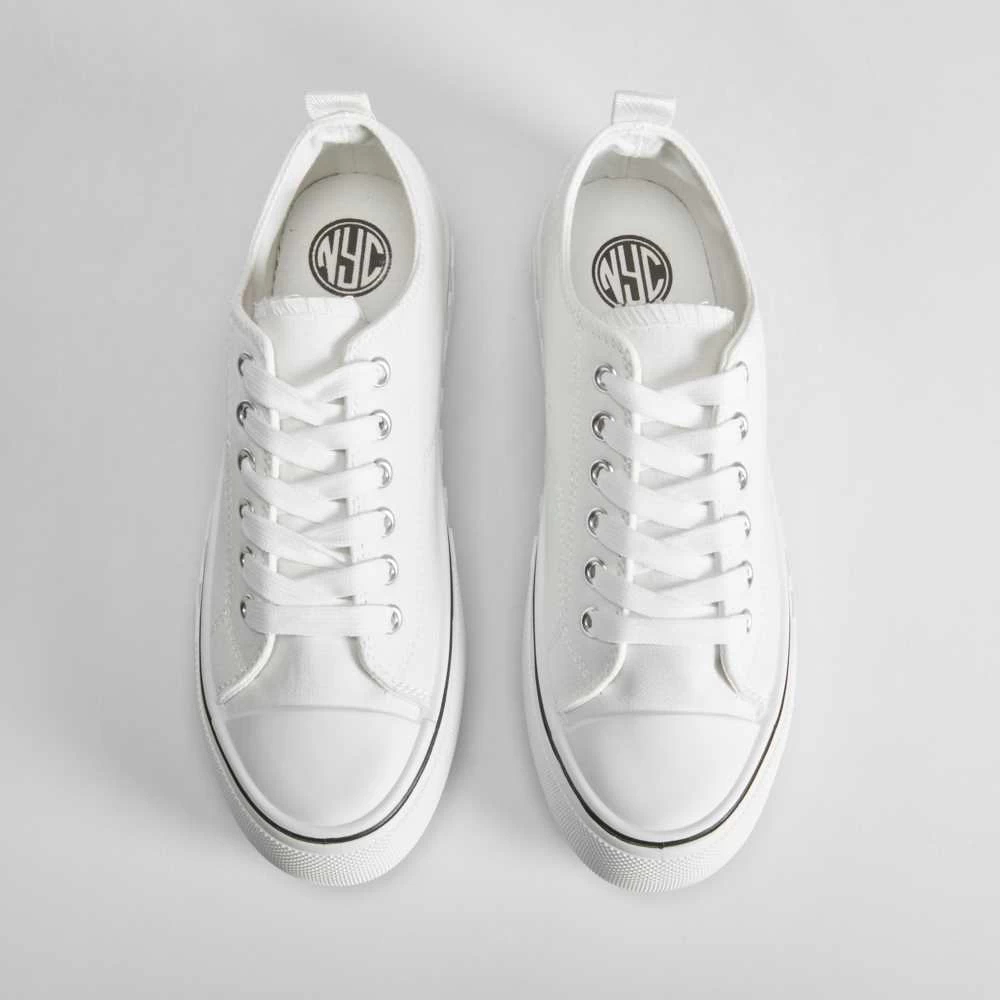 Zapatilla de lona baja con plataforma rayada de la marca NYC. Corte en color blanco con cierre de cordones.