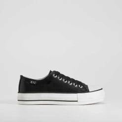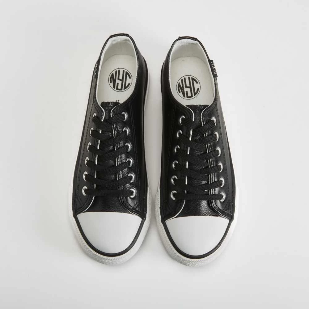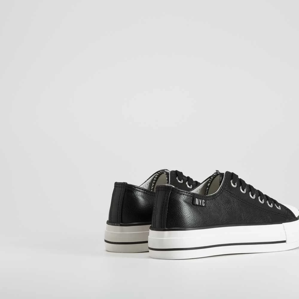 Sneaker básica de la marca NYC para mujer. Modelo en color blanco efecto piel con un cierre de cordones y un piso flatform de caucho con un cerco negro.