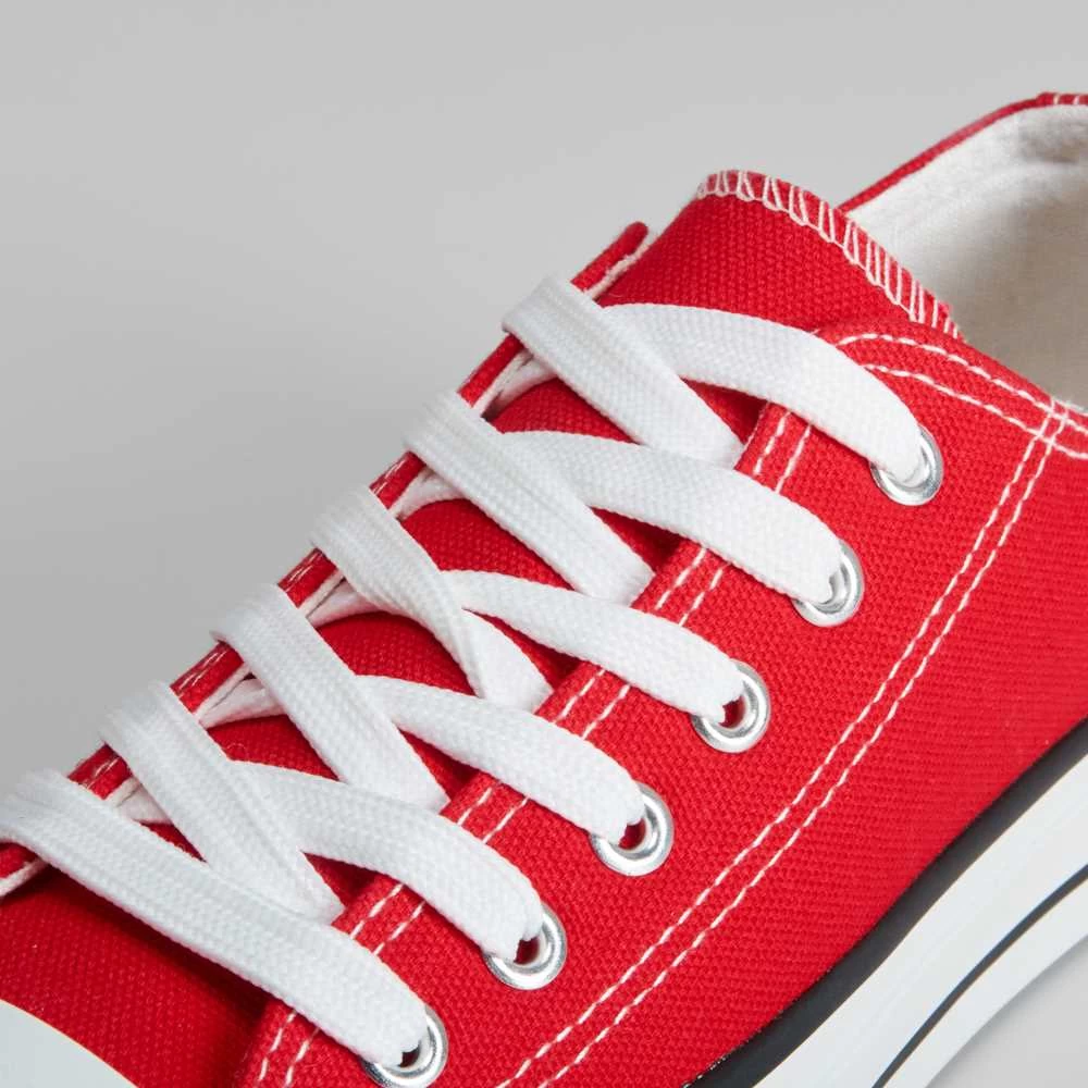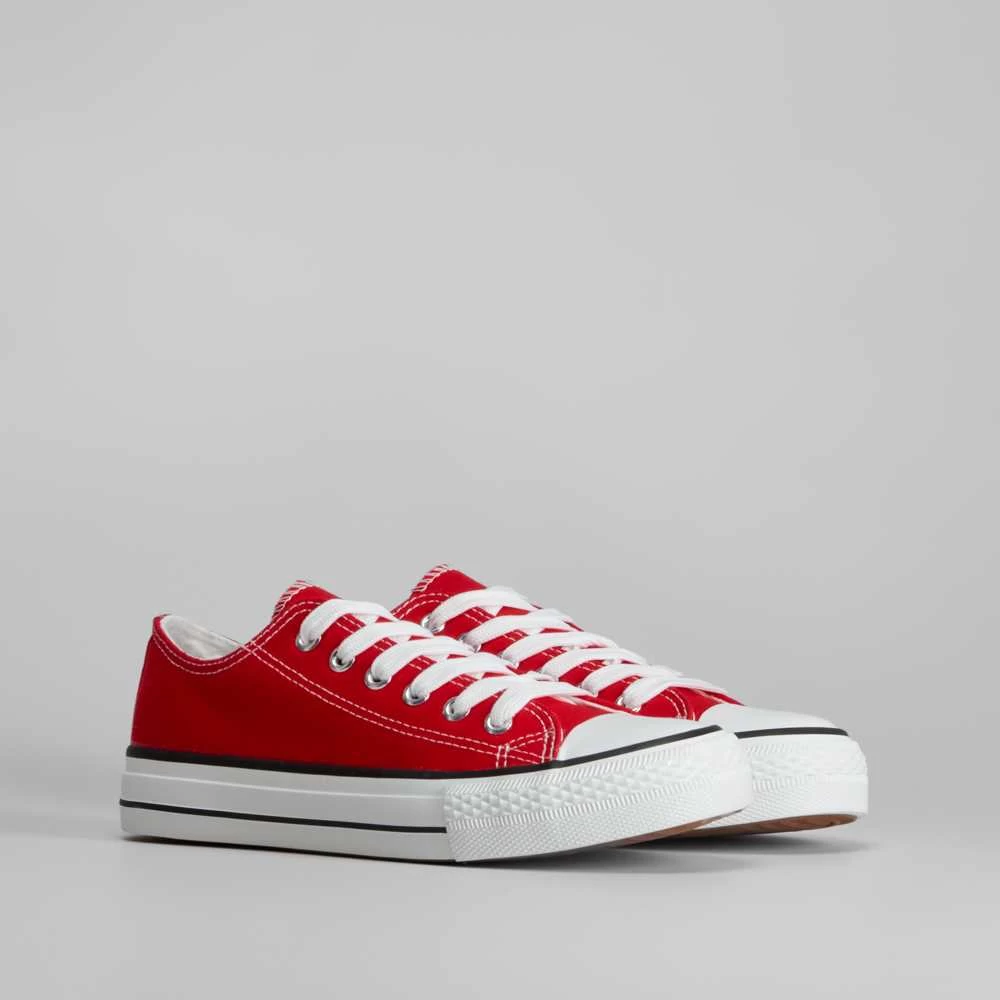 Zapatilla de lona básica de la marca NYC para mujer. Exterior textil liso y sencillo en color rojo. Cierre de cordones y puntera de caucho. .